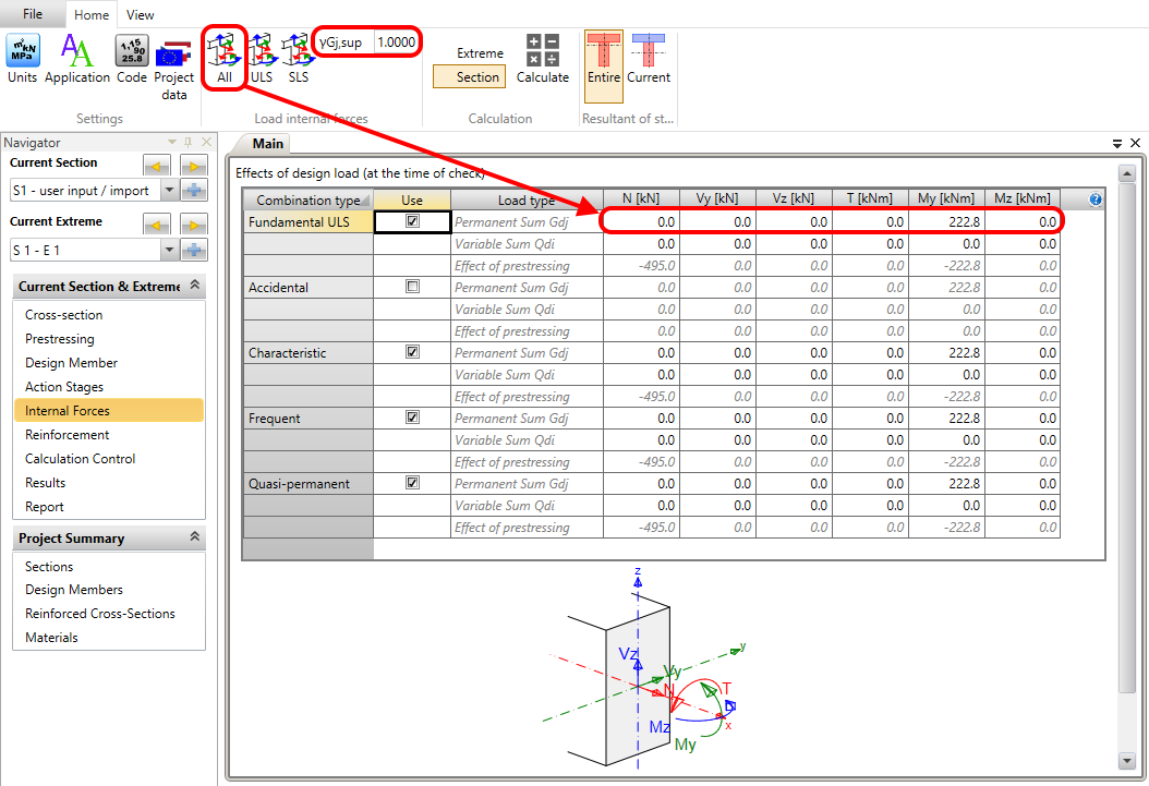 The total effect of the prestressing table shows Primary internal forces calculated from geometry and stress in the tendon and secondary internal forces which have to be inputted manually.