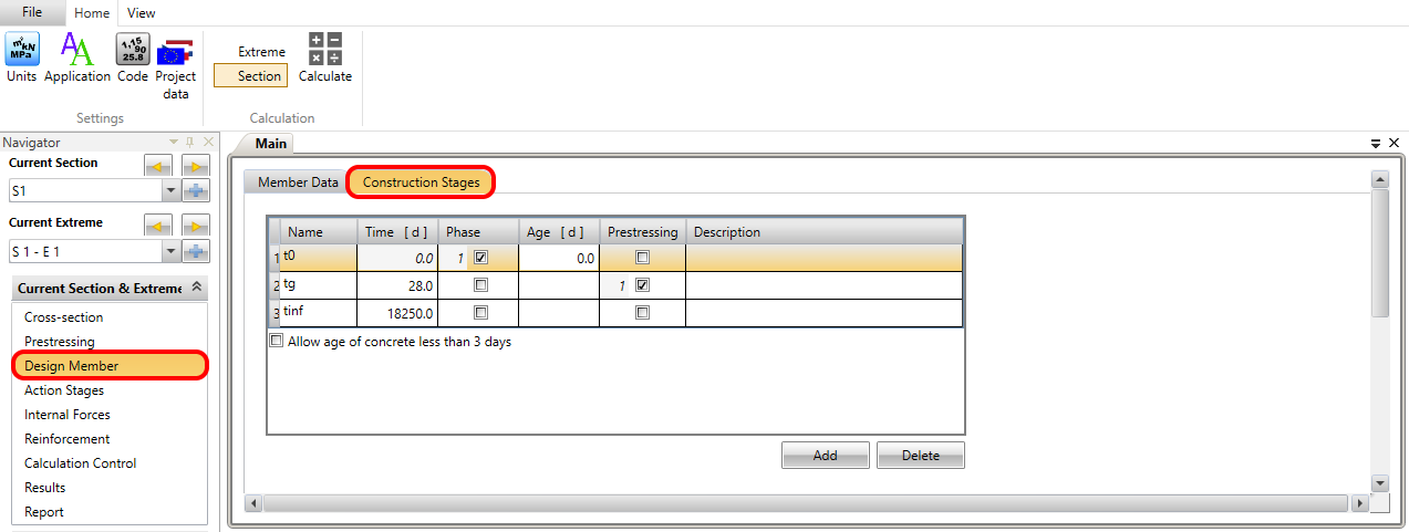 First, the construction stages can be defined in Design member -> Construction stages. The Time of the phases, and prestress application can be set to the individual stage. New stages can be also added.