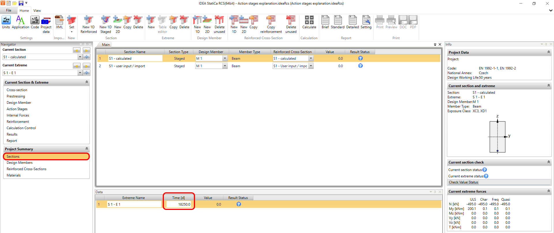 For our example, N=-495 kN and M = Mdl + Mp = 0 kNm are inputted t=18250d stage.