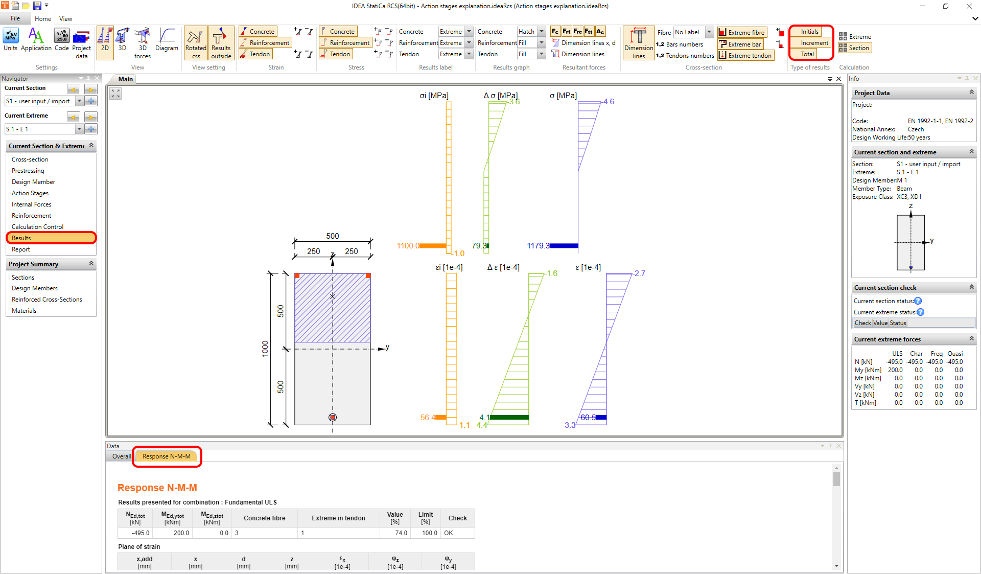 In the Action stages tab, the goal is to define the initial stress-strain state of the cross-section. This is the stress state of the cross-section from permanent loads, prestressing, creep, and shrinkage in the individual stages of construction. The inputs are obtained from the global calculation FEA model. The response of the cross-section in SLS and ULS is then calculated by further loading (variable load, etc..) of the cross-section from this initial state, respecting the working diagrams of the materials. In the Action Stages tab, the initial state of a general cross-section, including phased (composite) cross-sections, can be defined, making the method general. If you are interested in the composite cross-sections it is recommended to go through the tutorial: Structural design of composite concrete section in RCS (EN).