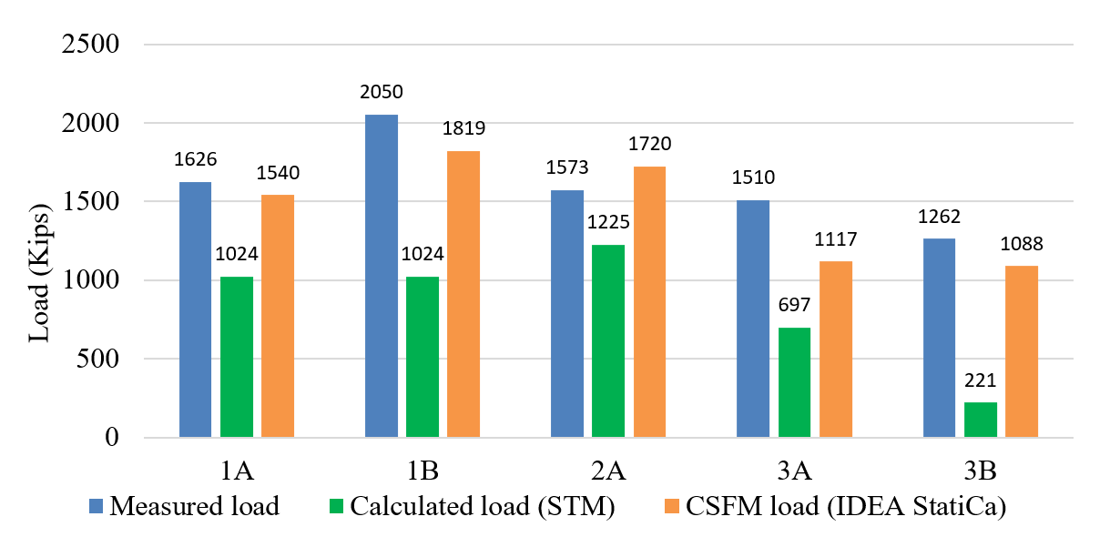 Figure 2.48 compares the loads acquired from experiments, STM, and IDEA StatiCa for deep beam specimens. The IDEA StatiCa results closely match the experimental results, outperforming conventional methods like the STM in offering nearly precise predictions of deep beam performance. Across all specimens (1A, 1B, 2A, 3A, and 3B), IDEA StatiCa consistently exhibits closer alignment with the measured load capacities (Pmax). It should be noted that STM is developed for design purposes and is expected to yield conservative results. On the other hand, IDEA StatiCa is expected to capture the maximum measured response of the deep beams.