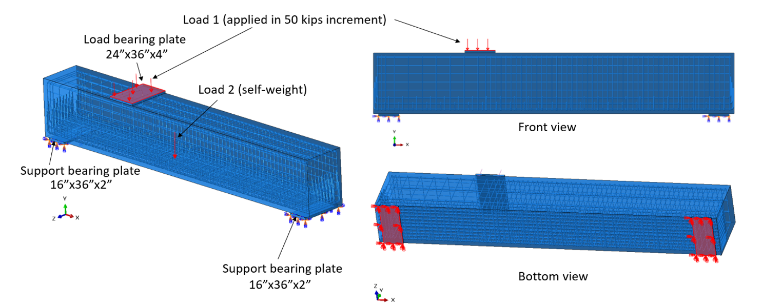 In this section, the baseline model developed in Section 2.4.1 (i.e., Specimen 1A) was reconstructed using ABAQUS software (2023) for finite element (FE) analysis, and the results were compared with those obtained from IDEA StatiCa. In the model, in addition to the self-weight, the vertical load of 1,572.5 kips (6995.3 kN) (in 50 kips increments) was imposed to the top load bearing plate with a thickness of 4 in. (101.6 mm) as illustrated in Figure 2.40. Two boundary conditions similar to the experimental tests and IDEA StatiCa model (i.e., simply supported beam) were applied to Specimen 1A (see Figure 2.40 again). In ABAQUS, the element size was chosen to be 0.5 in. (12.7 mm) after routine mesh sensitivity analysis, resulting in a total of 89,510 elements in the model. The 3D stress, 8-node linear brick reduced integration (i.e., C3D8R) was selected as the element type for the concrete, while the beam element was chosen for the reinforcement bars.