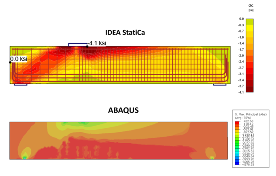 Figure 2.45: Comparison of the calculated principal stresses in concrete between IDEA StatiCa and ABAQUS.