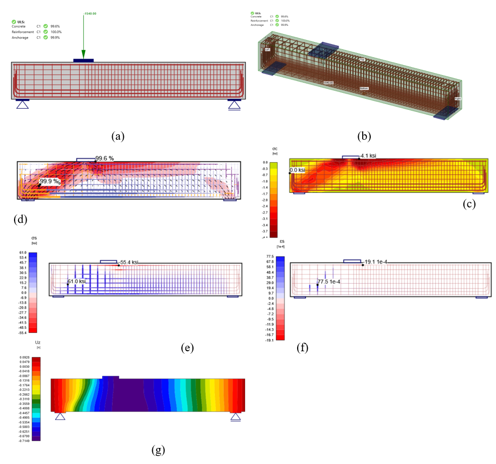 Figure 2.35: Deep beam 1A at 1540 kips (6850 kN) loading: a) IDEA StatiCa results , b) 3D view, c) stress flow, d) concrete principal stress (σc), e) stress in the reinforcement, f) strain in the reinforcement, and g) deflection contour.