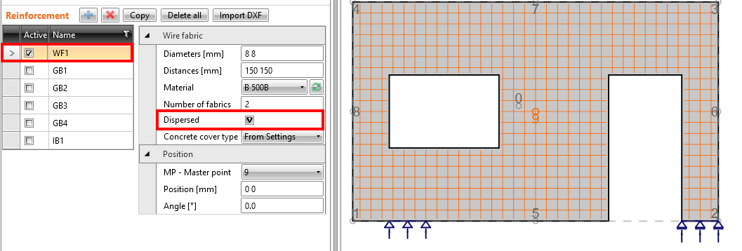 The functionality of dispersed reinforcement is based on the distribution (recalculation) of the reinforcement area in the section to an equivalent rectangle. This option is available for wire fabrics only (Fig.1). The area of the reinforcement in the section is the same for both the model with dispersed reinforcement and without it (Fig.2). The main advantage of this feature is the speed of the calculation for members with dense reinforcement, respectively for large models. Due to the recalculated area of the reinforcement into an equivalent rectangle, the model with dispersed reinforcement has a lower moment of inertia, therefore the stress in the reinforcement is higher and the model gets more flexible in bending. The resultant stresses and strains in the reinforcement directions 0˚and 90˚ are displayed by means of isobands (Fig.3).