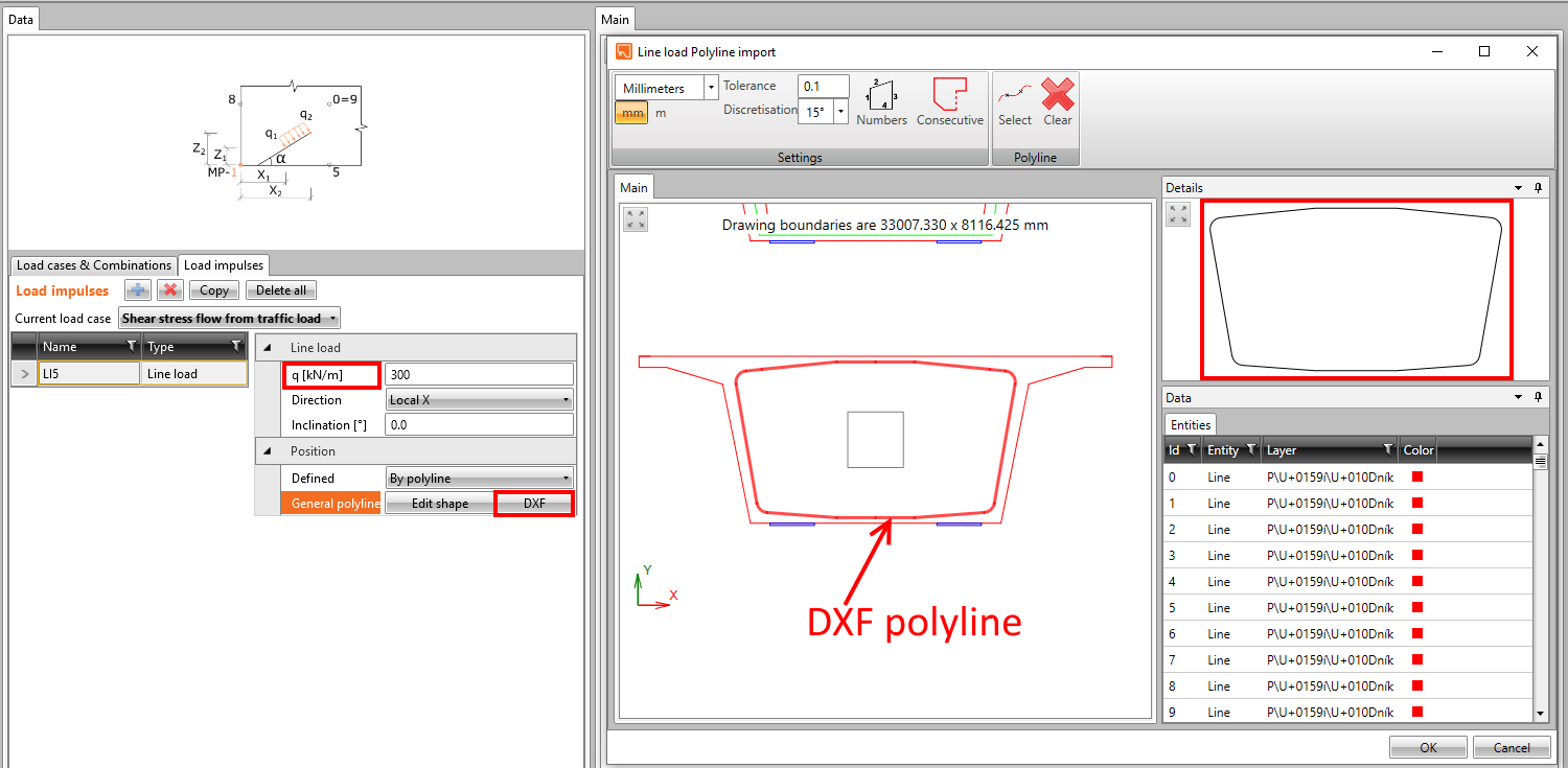 The new functionality load on a curve from DXF reference covers the solution of many problems and mainly saves time during the input of loads. The imported curve can be a line, polyline and even a spline, where curves are transformed to discrete coordinates (Fig.7). The uniform load is applied directly on the curve where the direction in the local or global coordinate system with the option of inclination can be edited (Fig.8).