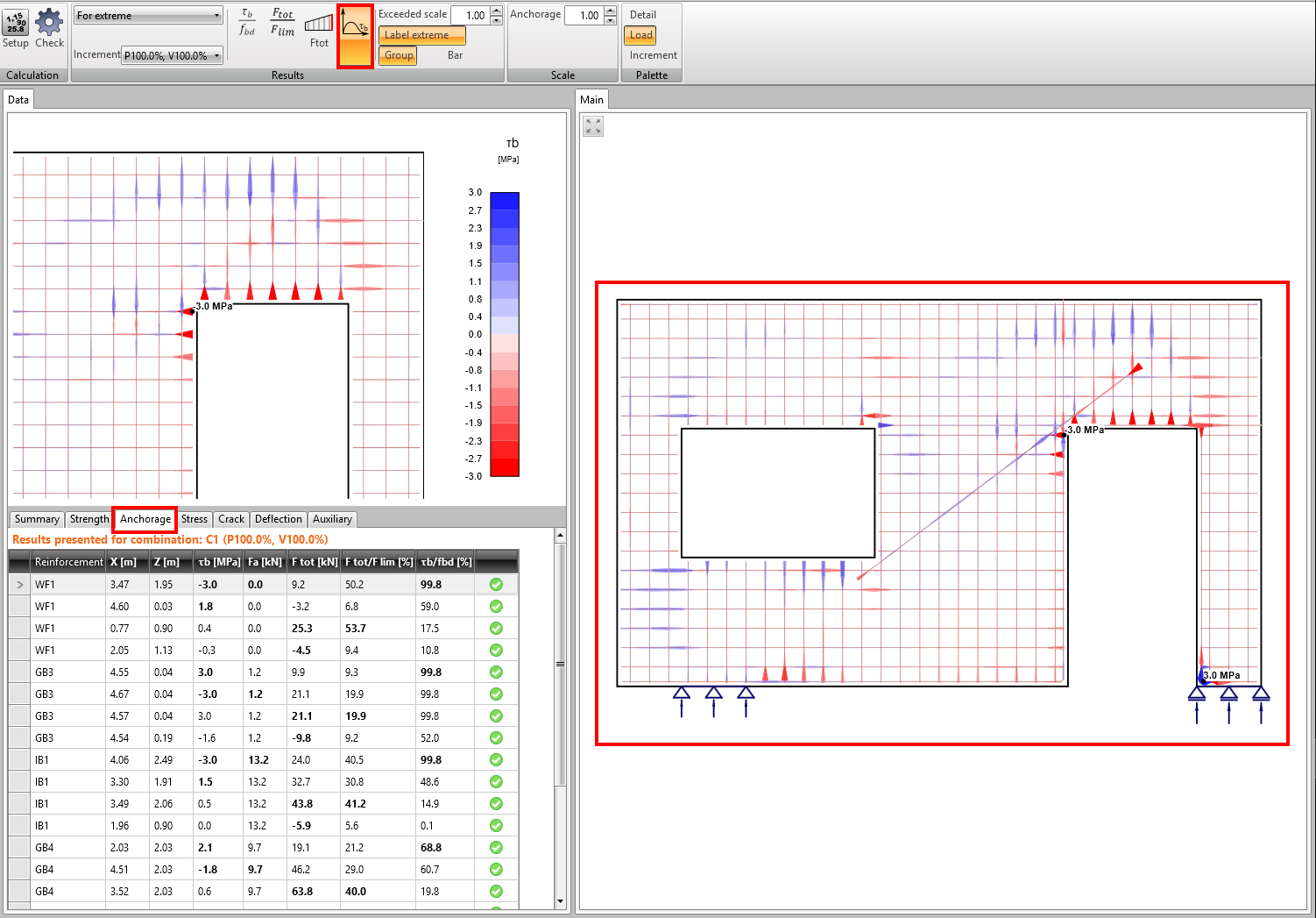The results of stresses, strains and all reinforcement code-checks are presented in the form of the intensity and color along the reinforcing bar (Fig. 4). The blue color stands for the stress and strain in tension and the red color for the compression. The same approach is used for the code-check of bond stress (Fig. 5), where the bond stress has the same properties of the display as the code-check of the strength of reinforcement.