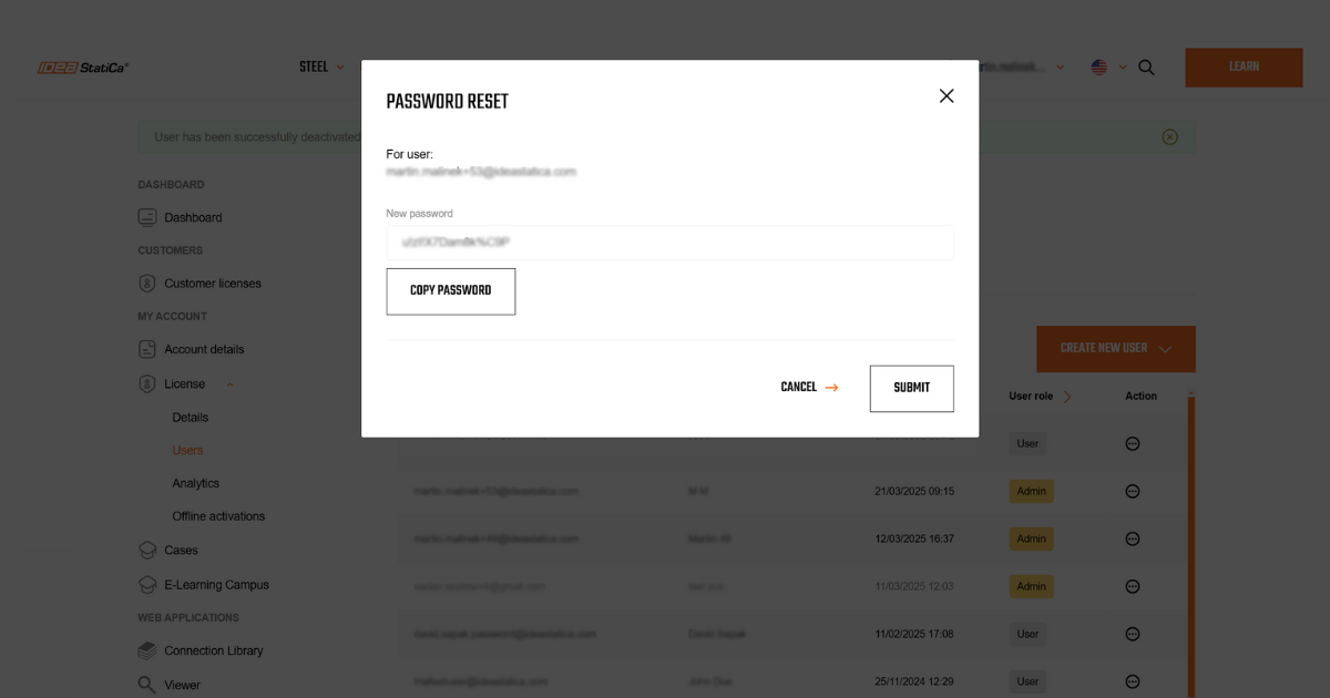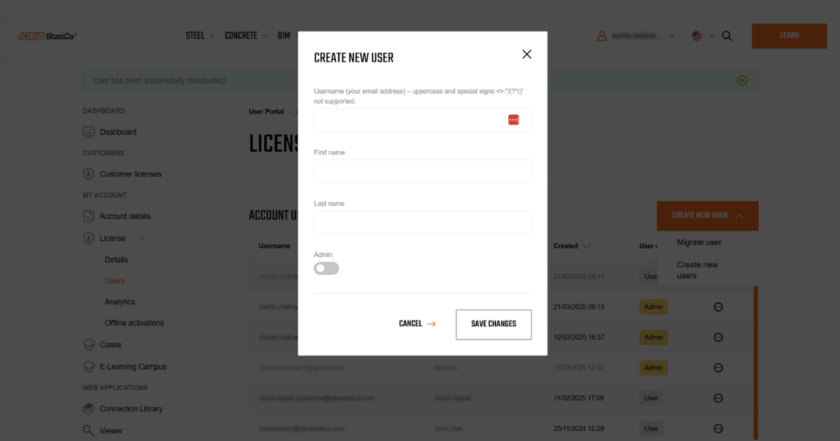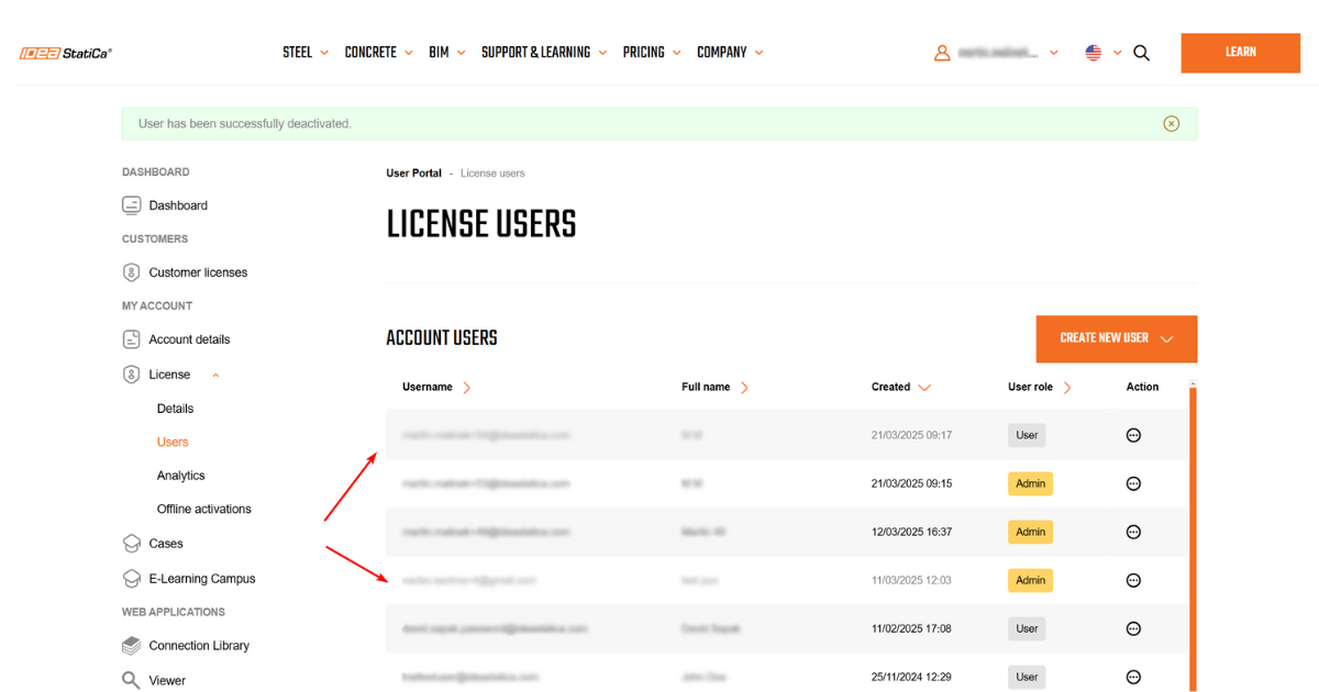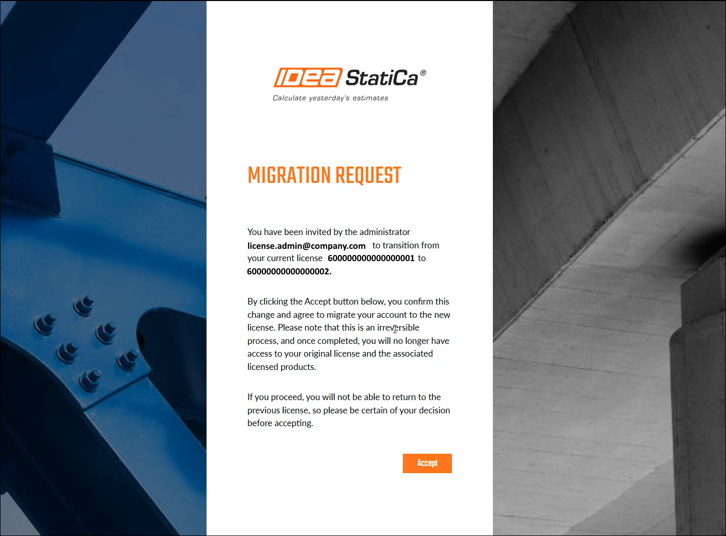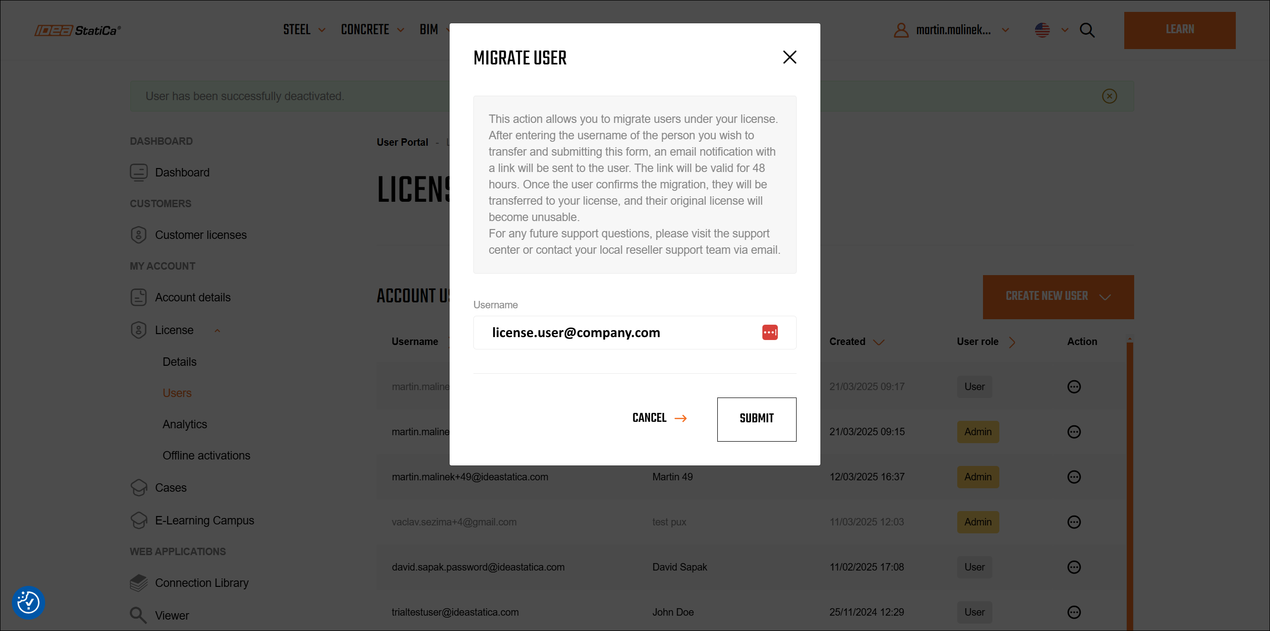 This process is completely manageable on the side of the customer without the necessity of contacting IDEA StatiCa support. The migrated user gets a confirmation notification about being added to the company license pool of users.