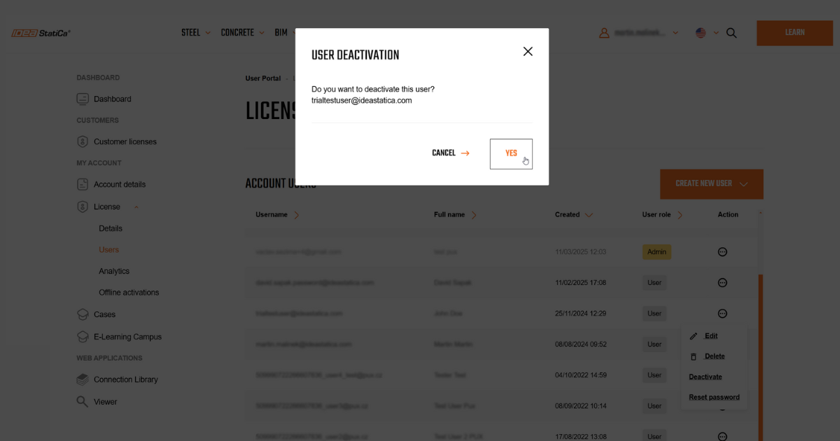 In cases where IDEA StatiCa users work on different types of licenses (commercial, trial, educational), the company license administrator can migrate the users' accounts under the main company license.