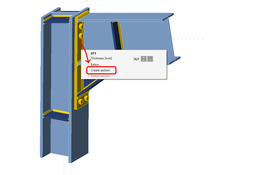 To add a new section to produce a drawing or sketch, select a plate in the connection model, and in the right-click menu select Create section. To delete it, select the plate and choose Delete section.