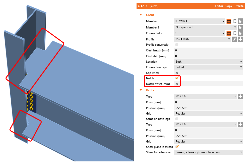 In the case of the members' clash, the opening-notches had to be defined manually by the Opening manufacturing operation on the member flanges. This situation was causing an increased quantity of manufacturing operations. From now on, the feature Notch can be used whenever it is needed to avoid clashes between column-beam or beam-beam. This feature is implemented to Manufacturing operations End plate, Fin plate, Cleat.