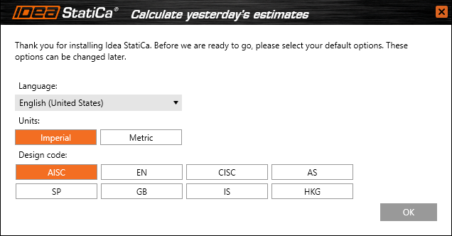 User preferences options which are available during the first start of IDEA StatiCa Connection.