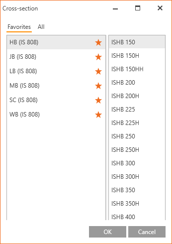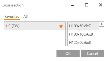 Cross-section library databases contain typical cross-sections for eight national design codes with a total count of more than thousand of items. That means a lot of possibilities for the design. But it can also make the process of listing and finding the desired cross-section awkward, especially for repetitive connection design. From version 20, the user can easily mark the desired cross-section family as a favorite one and let it get listed separately from the rest of the database. This speeds up the design process significantly.