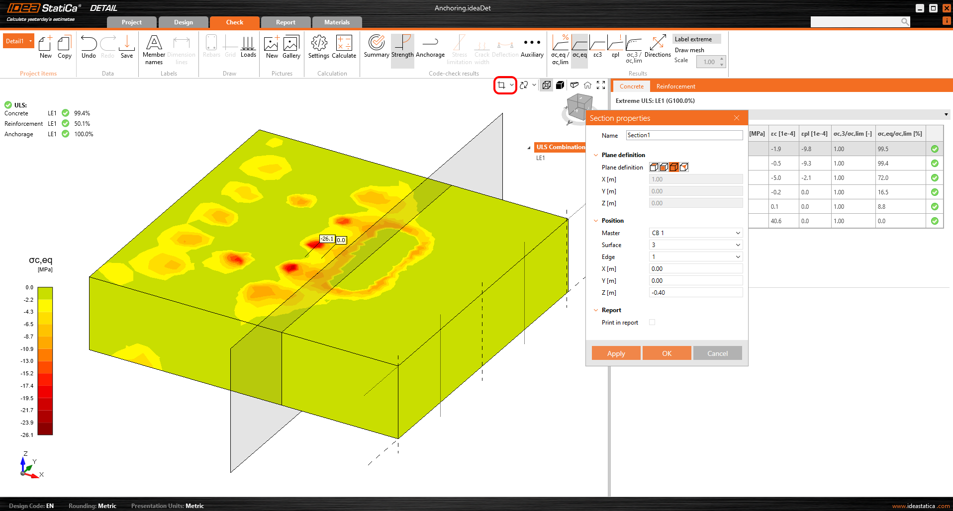 Section Results allow insight into the stresses within the concrete element. It is possible to create any number of sections and in any plane.