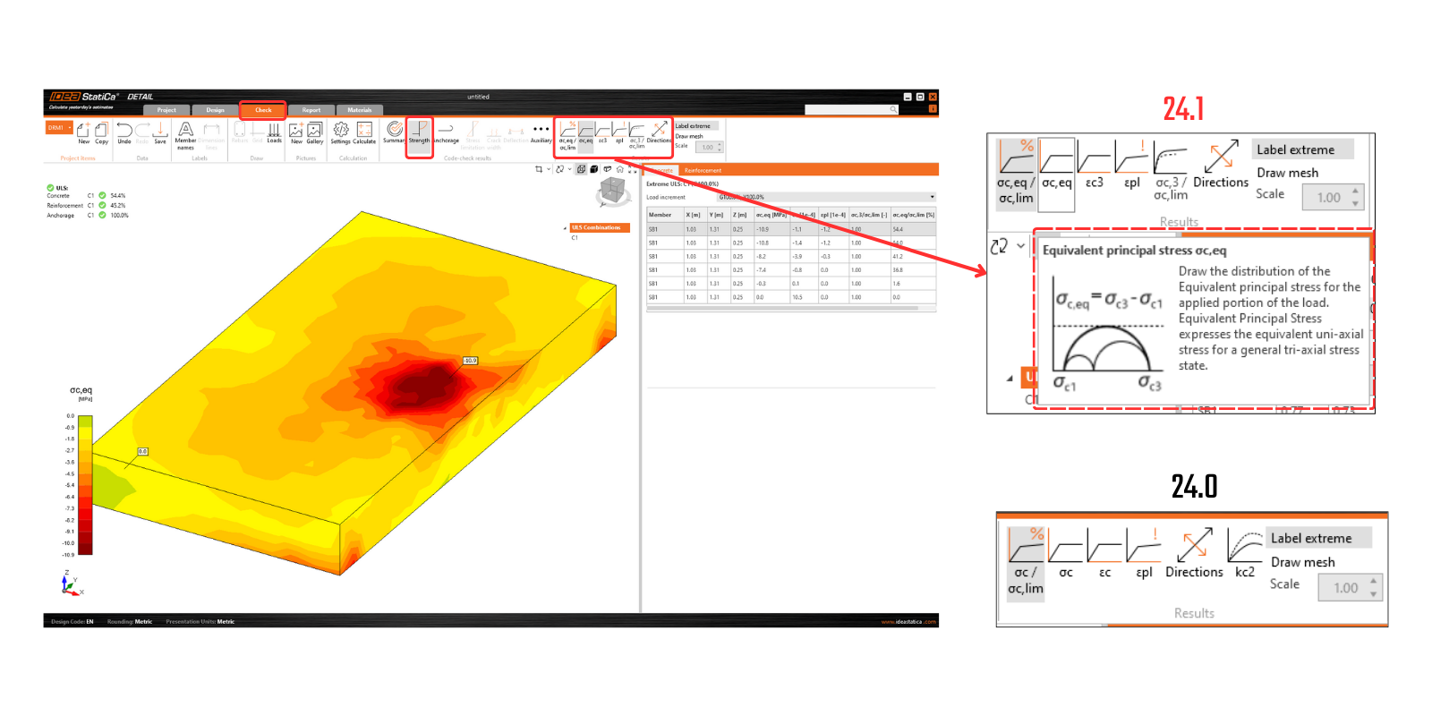 For a better understanding of the results and the theory implemented in the 3D Detail, the iconography has been significantly improved. In the "Strength" section, under the concrete stress assessment, you will find new icons and, most importantly, tooltips explaining the basic theory. These tooltips correspond to the theoretical background.