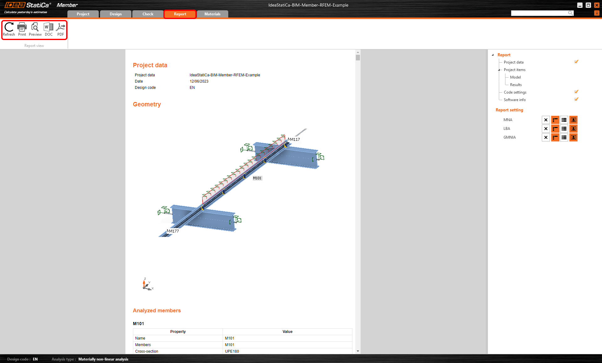 At last, go to the tab Report. IDEA StatiCa offers a fully customizable report to be printed out or saved in .doc editable format.