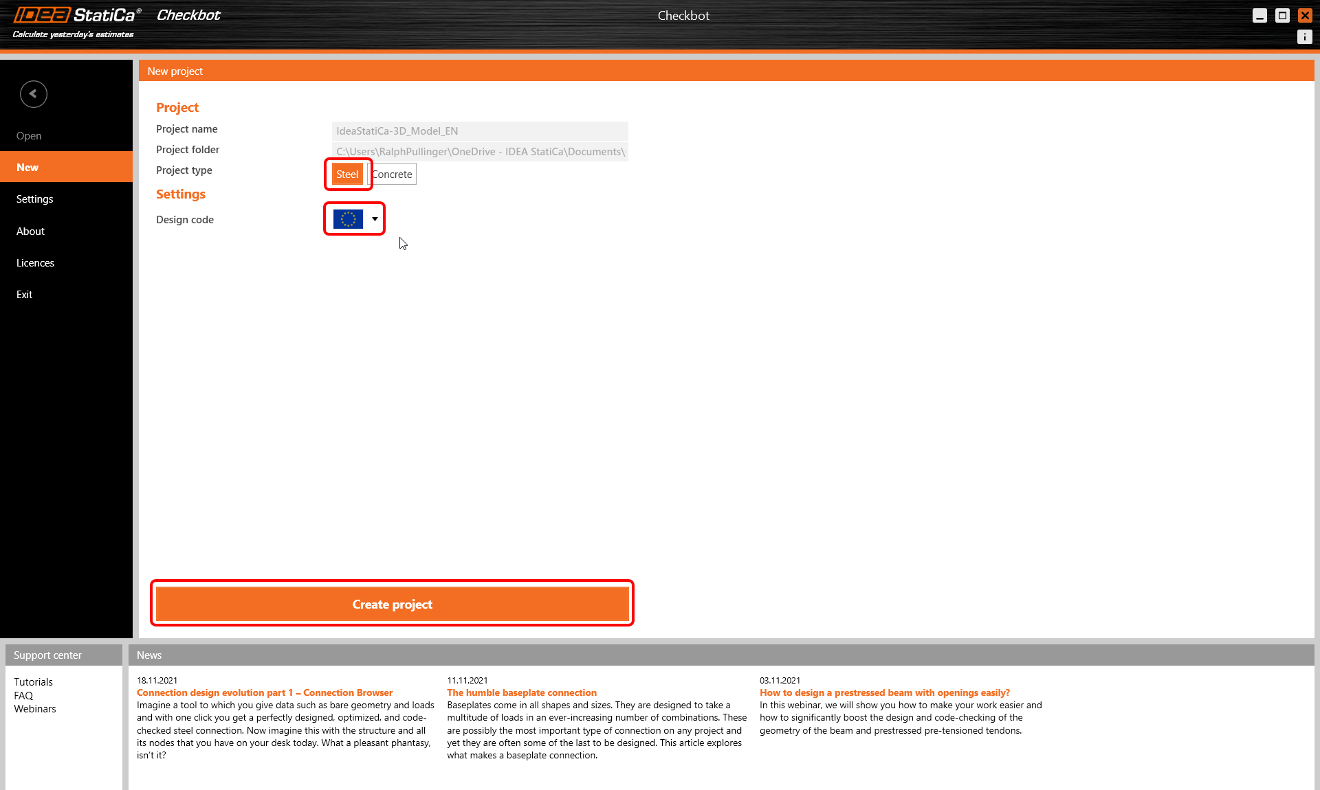 Select the New option with project type Steel and design code EN. Then select Create project.