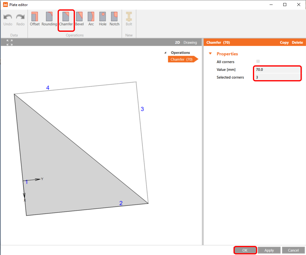 Here, add the Chamfer operation to cut the plate.