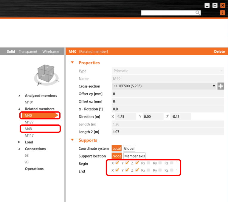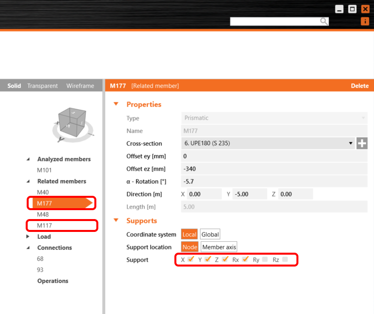For the proper structural behavior of related members, set the supports of the connecting purlins M177 and M117 to X, Y, Z, and Rx
