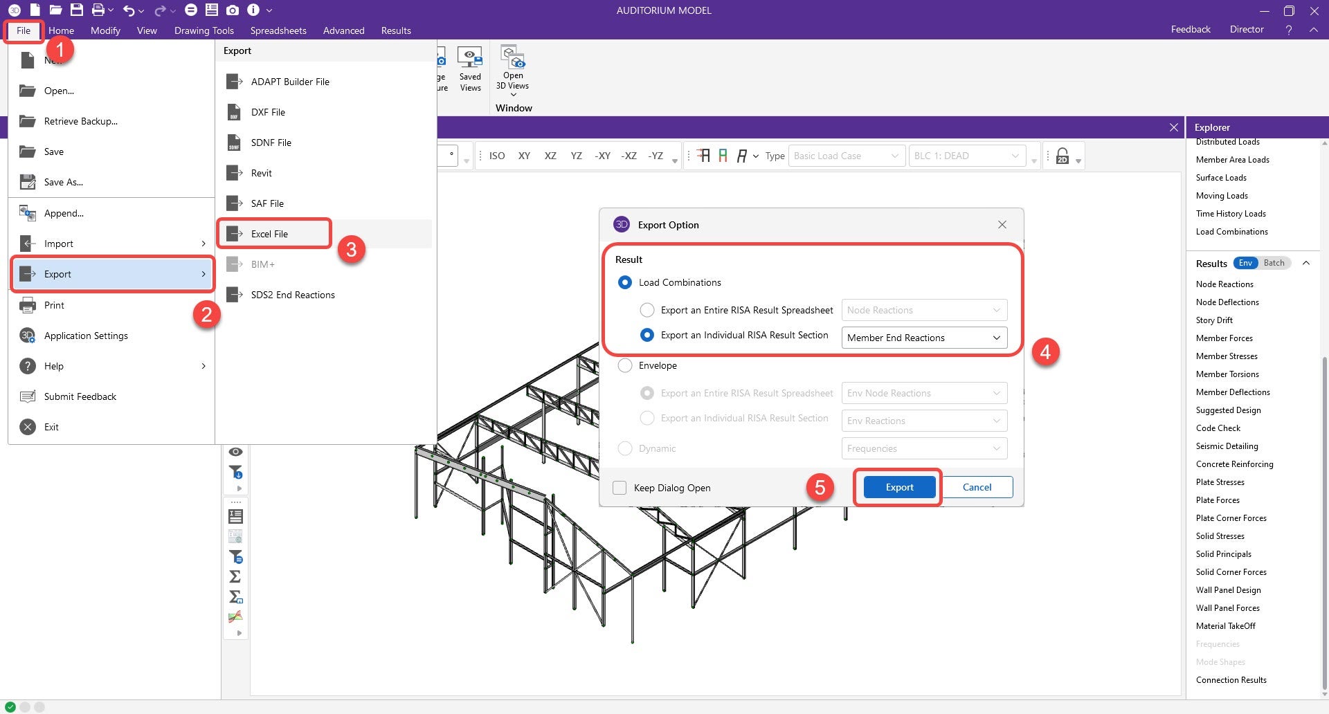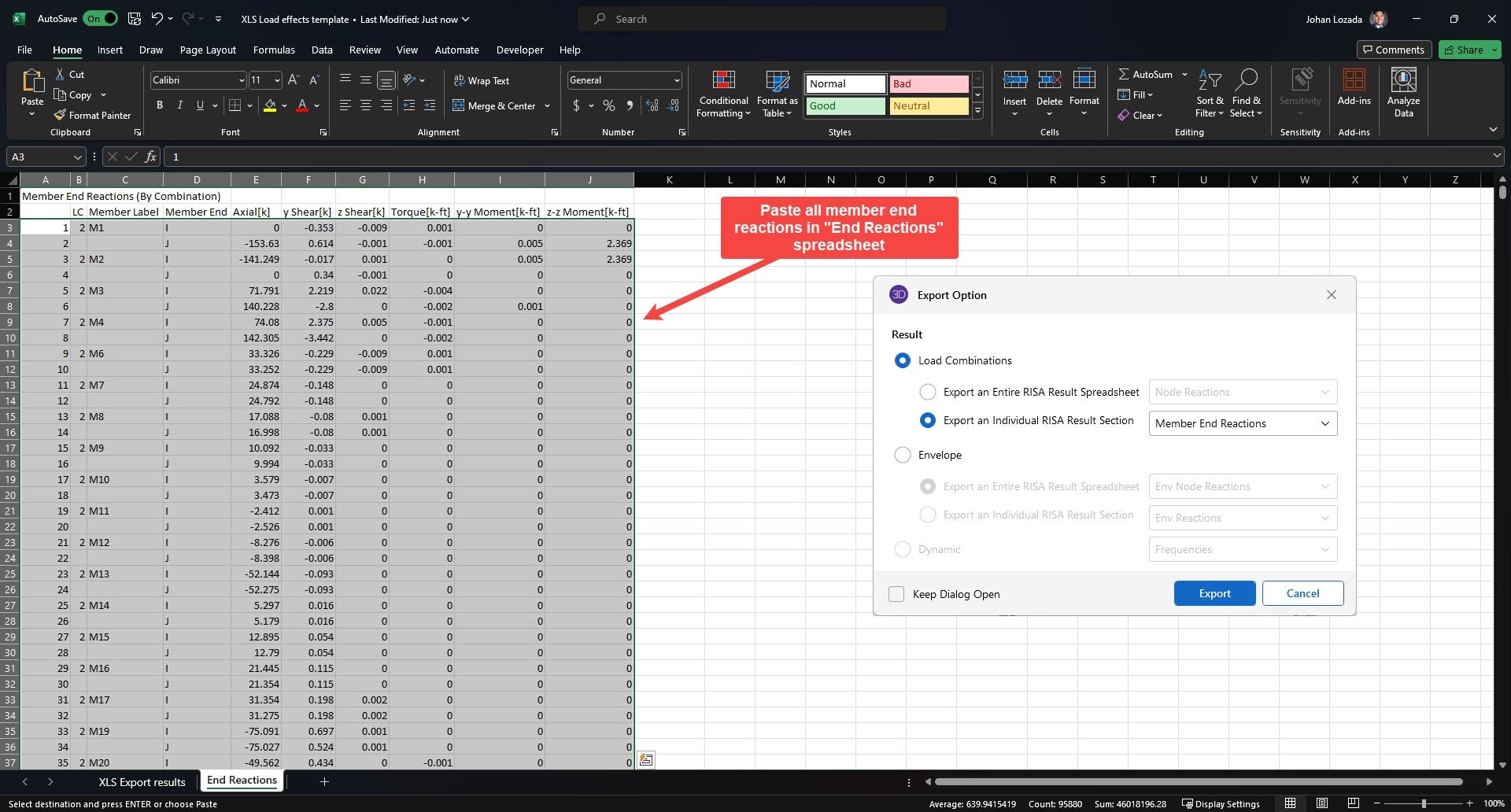 1. Export and save the load results from RISA. Ensure that the load combination results for the member end reactions are exported.