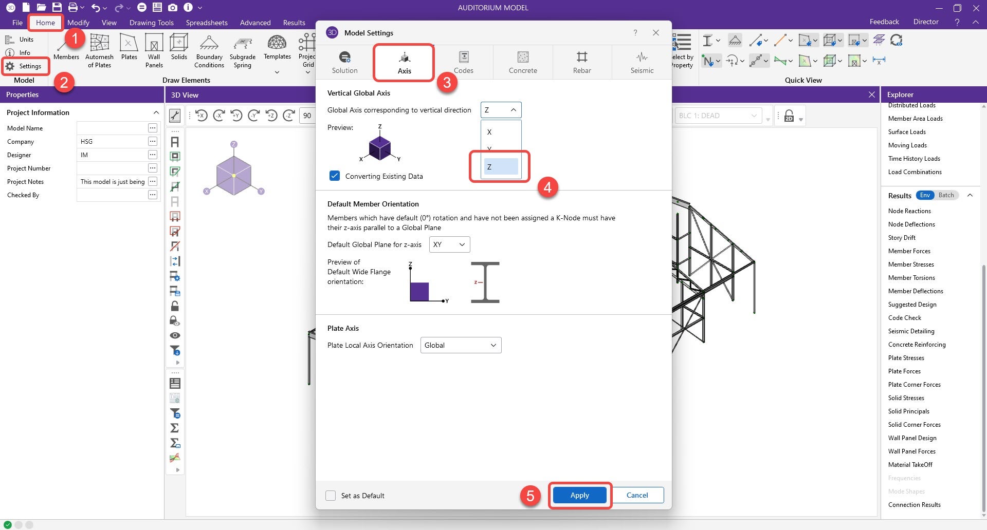 Note: Changing GCS from Y to Z can affect loading direction, such as member area load. You can save another copy of the RISA file, one for GBS adjustment and the other for analysis and results.