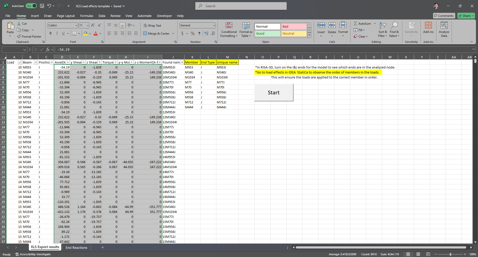 5. Click “start” so that the excel can convert the loads to be imported onto IDEA. Select all the load effects from columns D-I and copy them. (You can copy all loads at once)