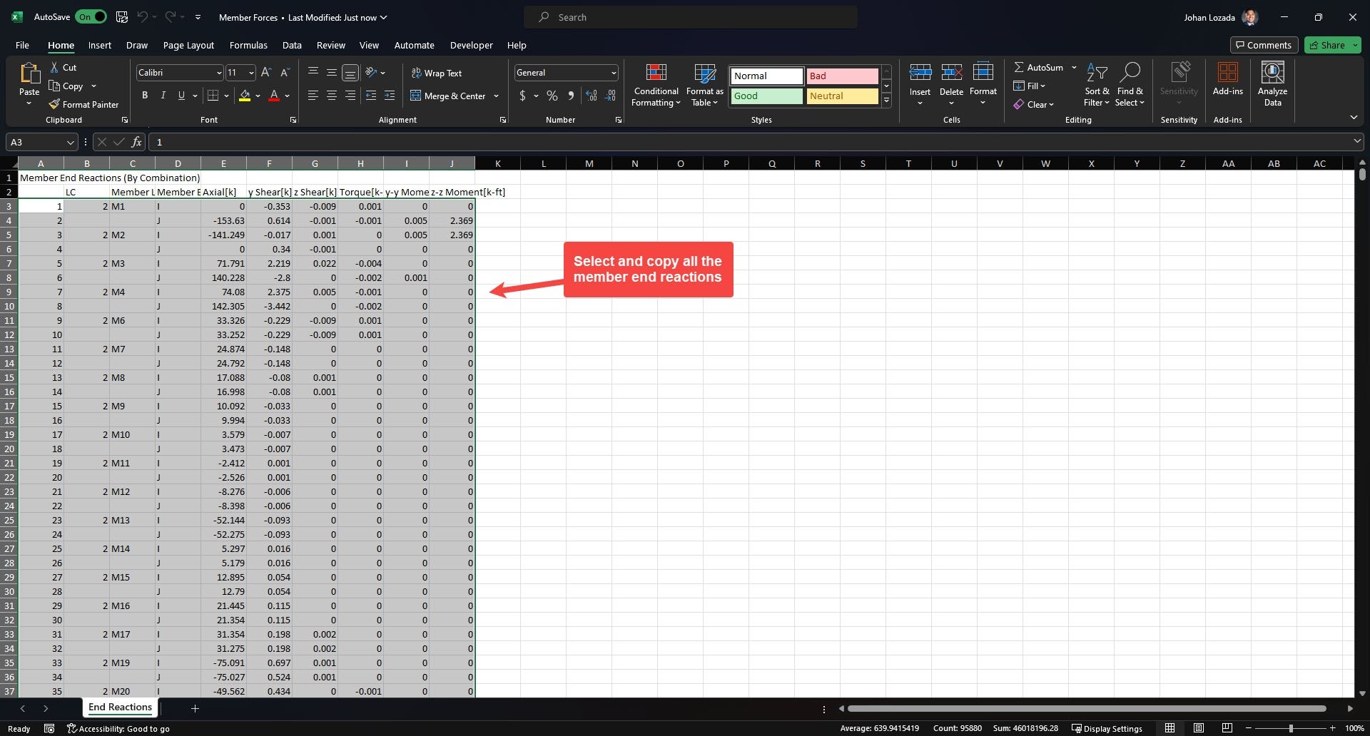 2. Open the Excel file. Select and copy all the member force information from columns A-J.