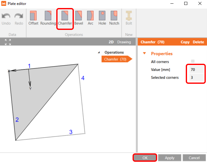 Then go to the Editor, select the chamfer operation, and set it according to the image.
