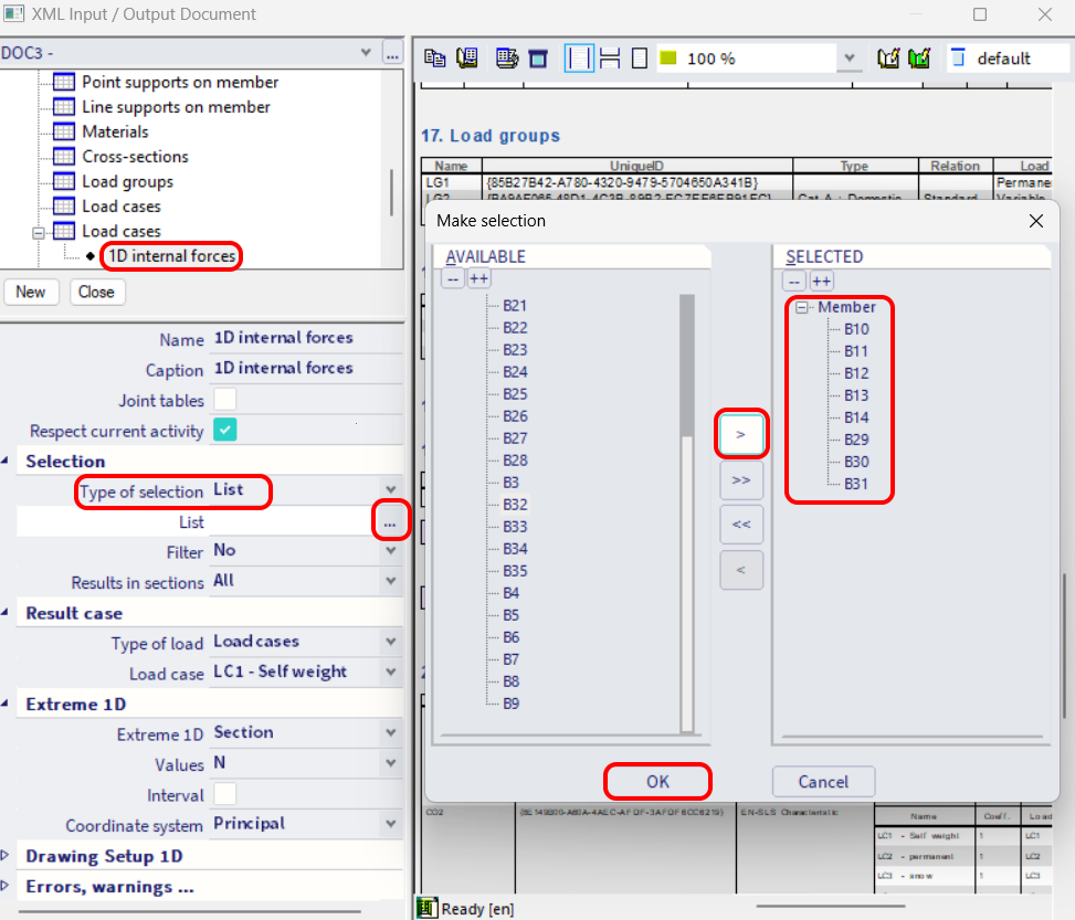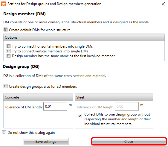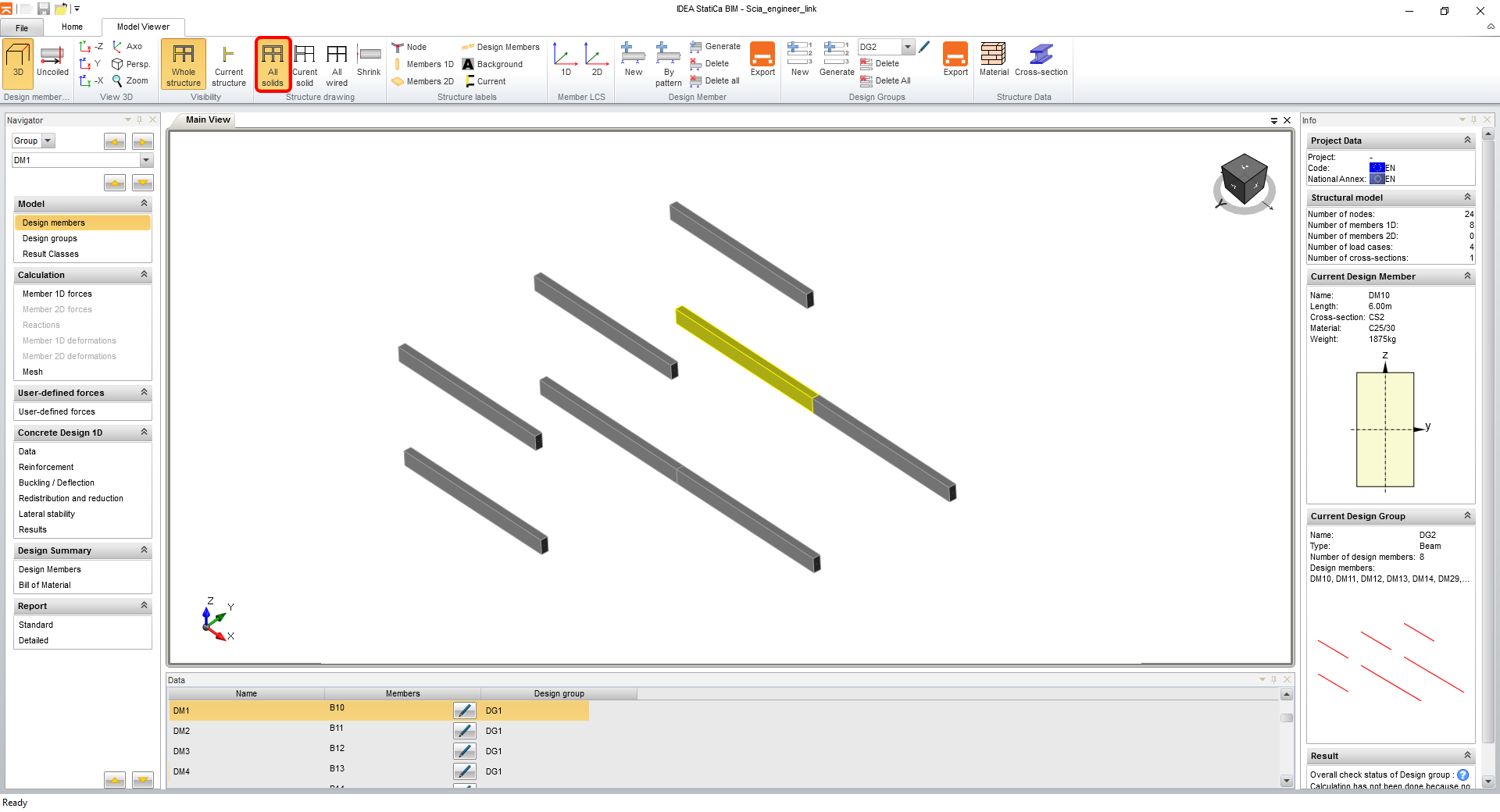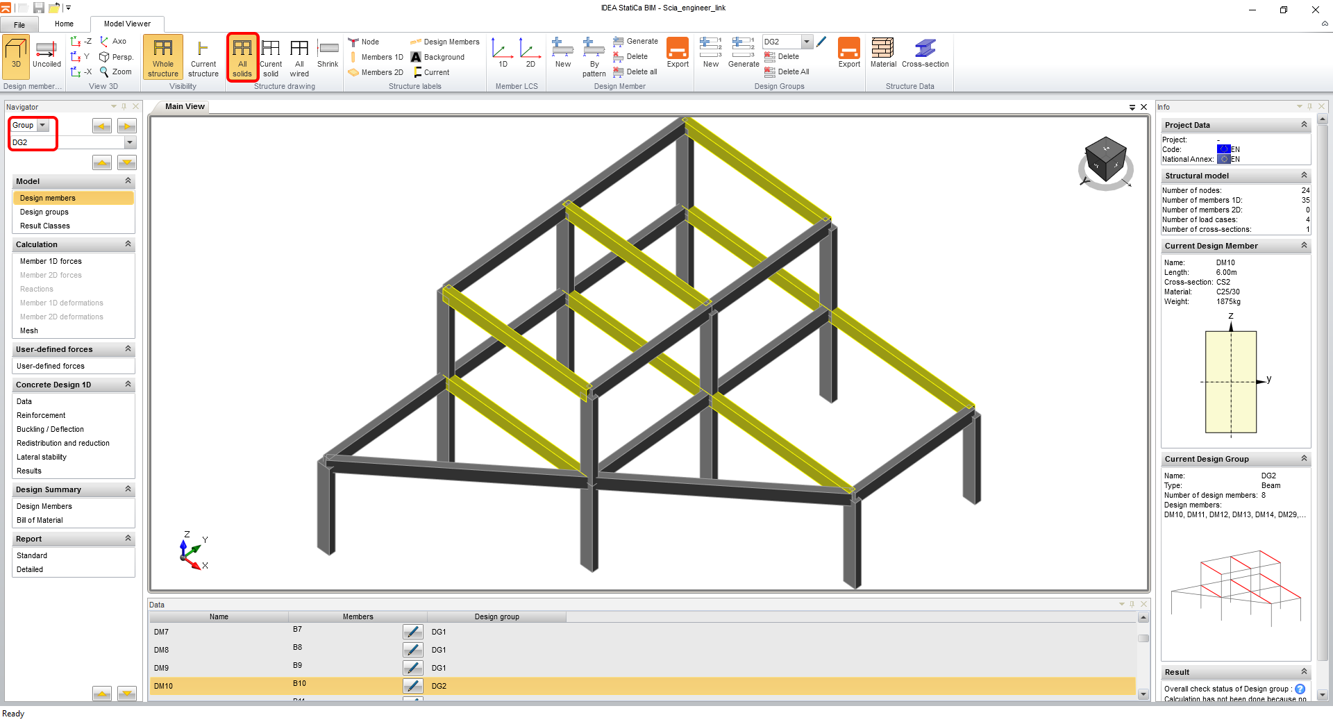 The imported model looks like on the following picture. For a better view, you can turn on the rendering of all members as All solids. Also switch to design groups and select DG2 as you want to check all beams, highlighted in the main window, at the same time.