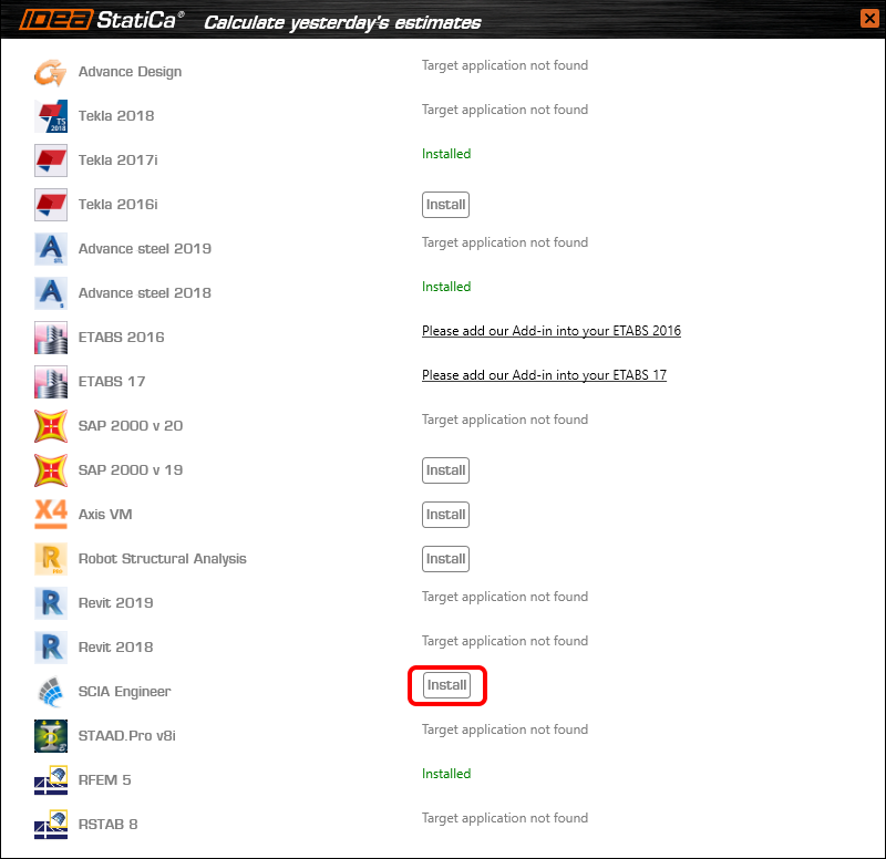 Select the software to integrate the IDEA StatiCa BIM link, click the Install button and check the Installed status.