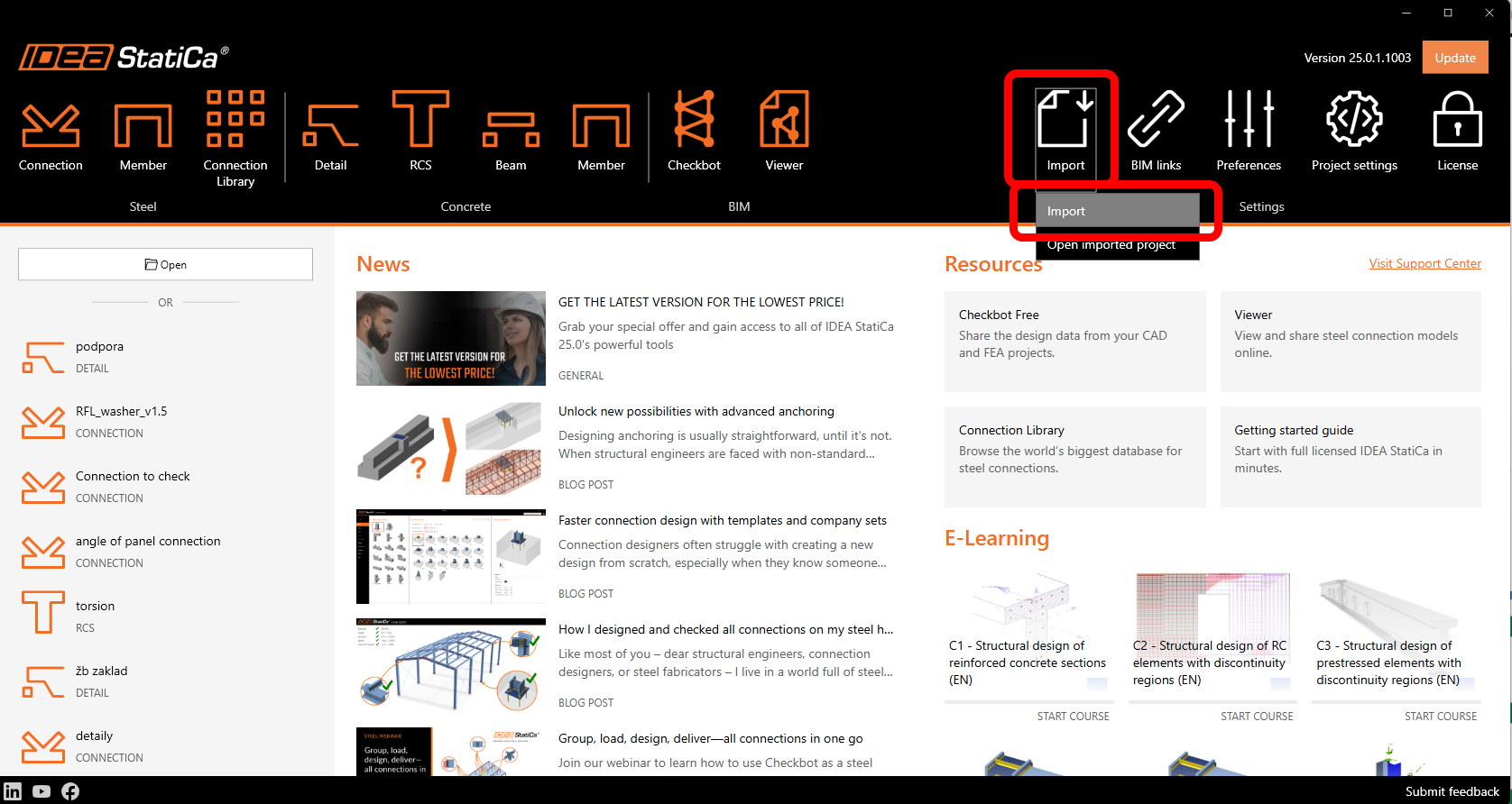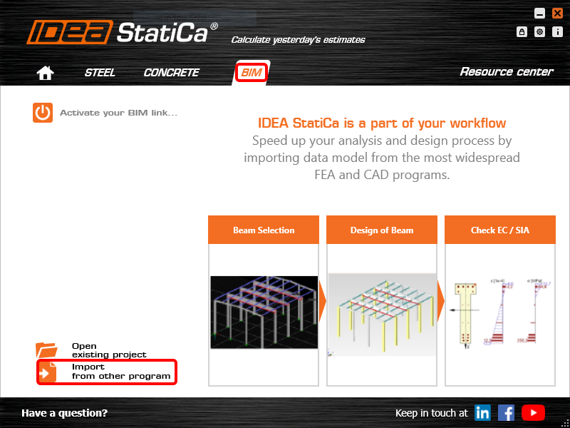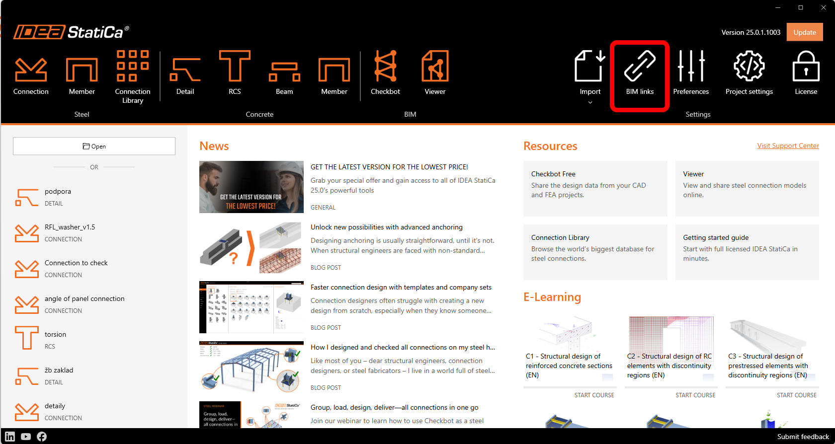 IDEA StatiCa automatically integrates the BIM link into your CAD/CAE software during its installation. You can check the status and activate more BIM links for later installed software in the BIM link installer.