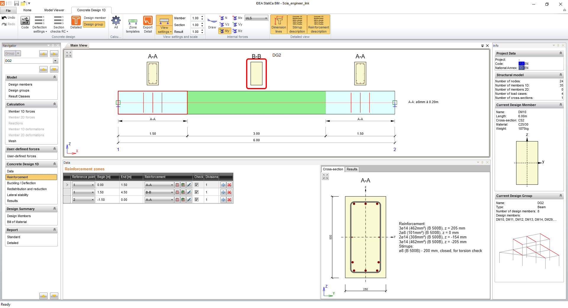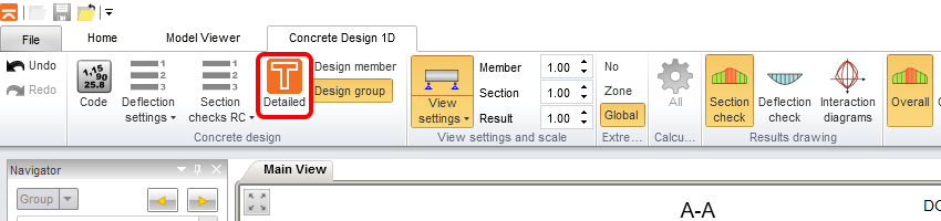 When you change the tab to Results you can go through all the checks and detailed results also in a visualized way together with all input/output parameters. On the left, in the navigator, you can switch between sections and extremes, for which you are plotting the results. Our screenshot shows the results of the first reinforcement zone A-A and Shear assessment results.