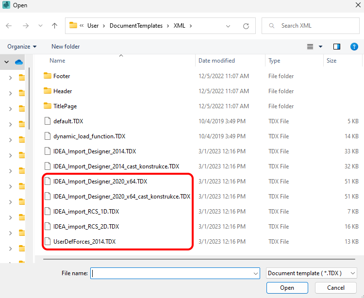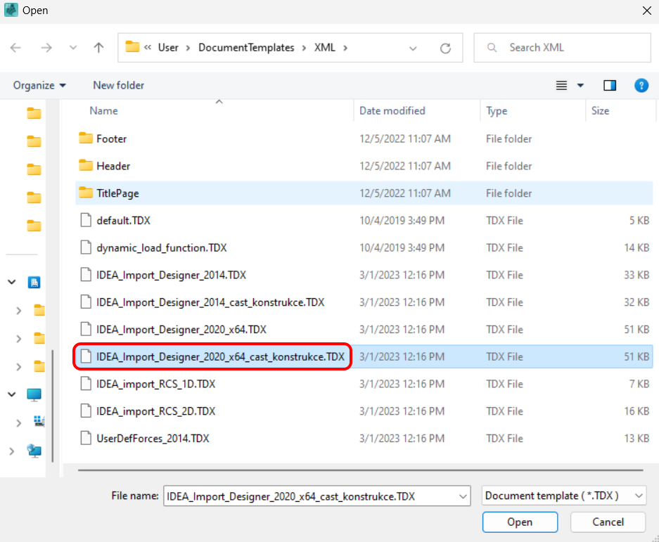 IDEA_Import_Designer_2020_cast_konstrukce.TDX is a template for the export of parts of the model in Scia Engineer and is well described in chapter 7 of this tutorial.