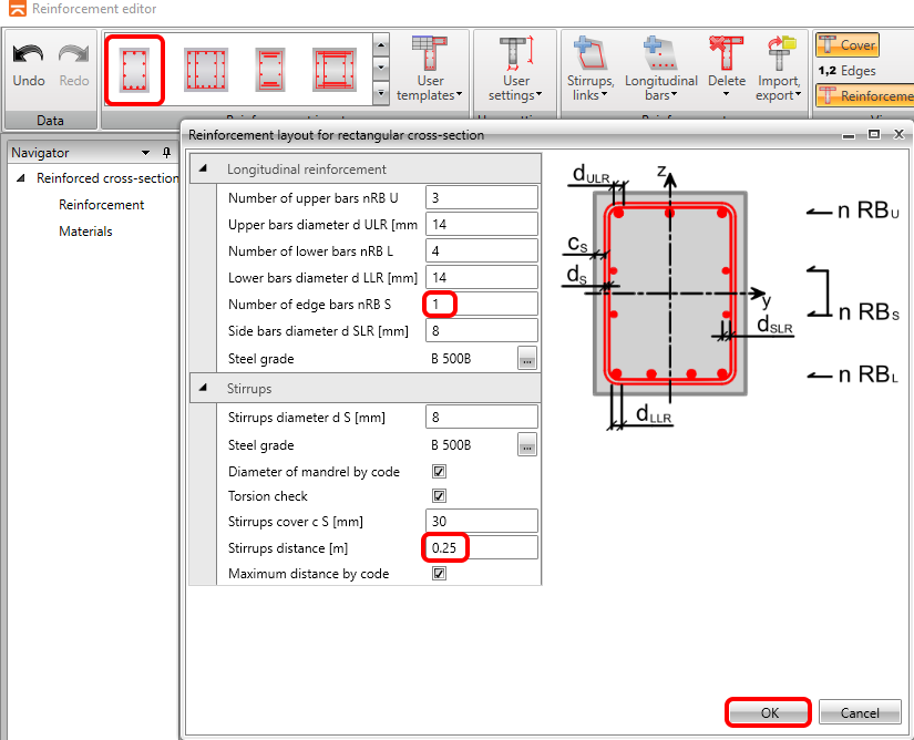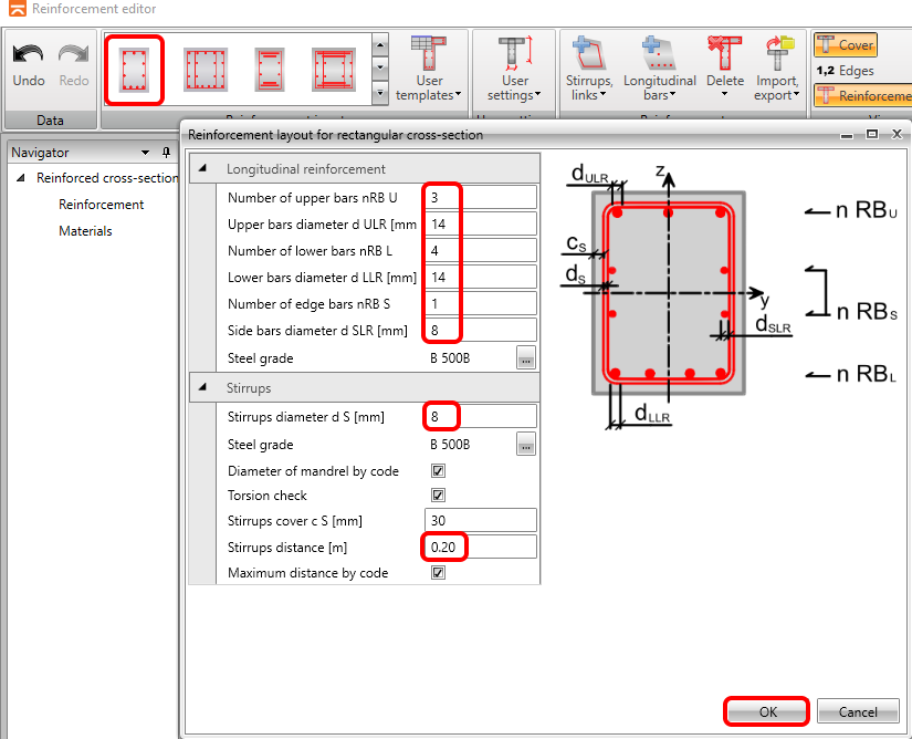 You will use the template for rectangular cross-sections, input the parameters and finish by clicking on OK.