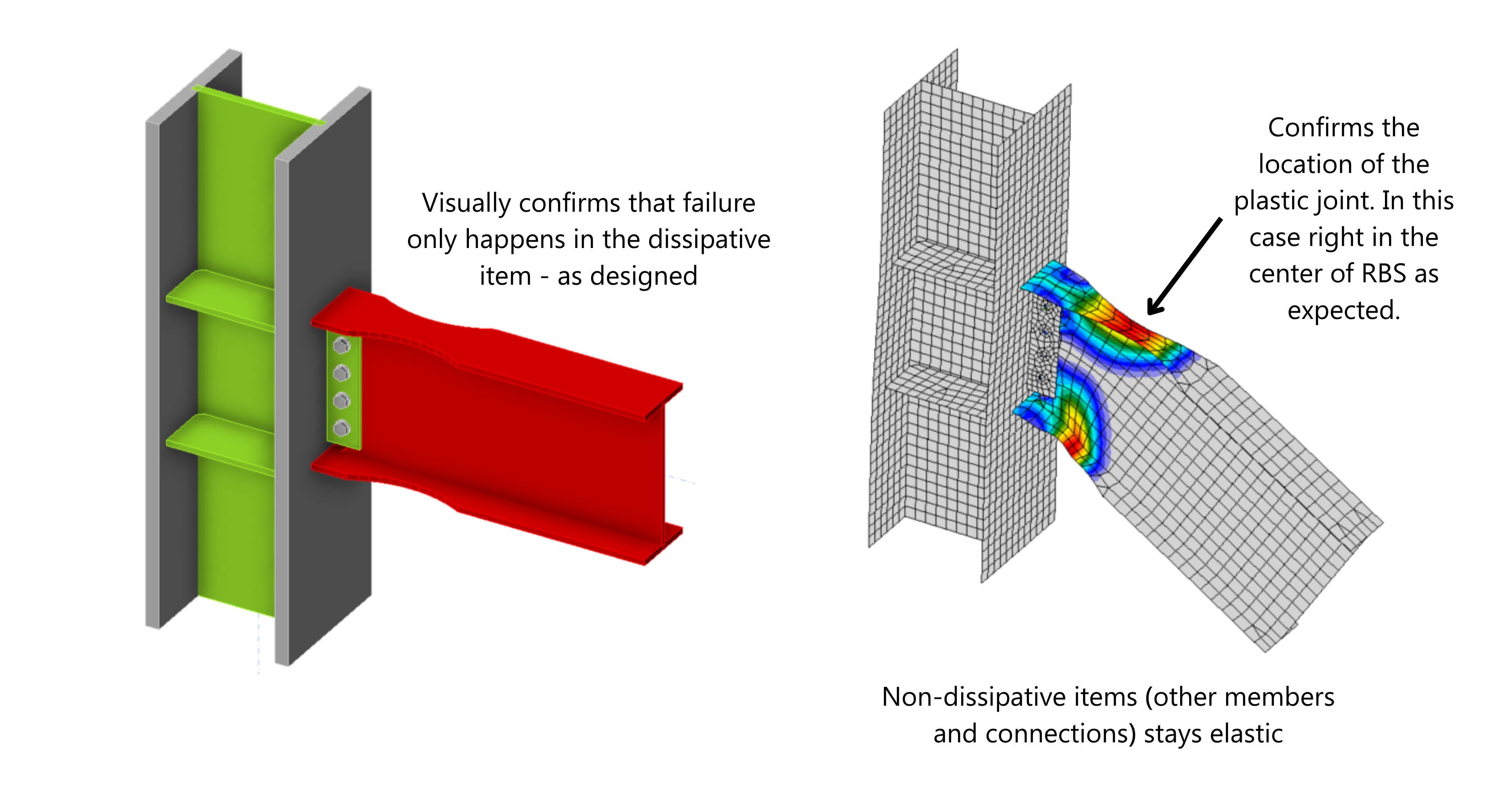 Although codes and design guides provide formulas to ensure yielding occurs in the intended elements, these checks can be complex, system-specific and connection-specific. This means that the engineer has to create separate spreadsheets for each system and connection. In addition, once the design is complete, traditional methods offer no direct way to visualize how a connection behaves under seismic loads or where plasticity develops. Furthermore, if the connection is not covered by design guides, the engineer is left without clear directions.