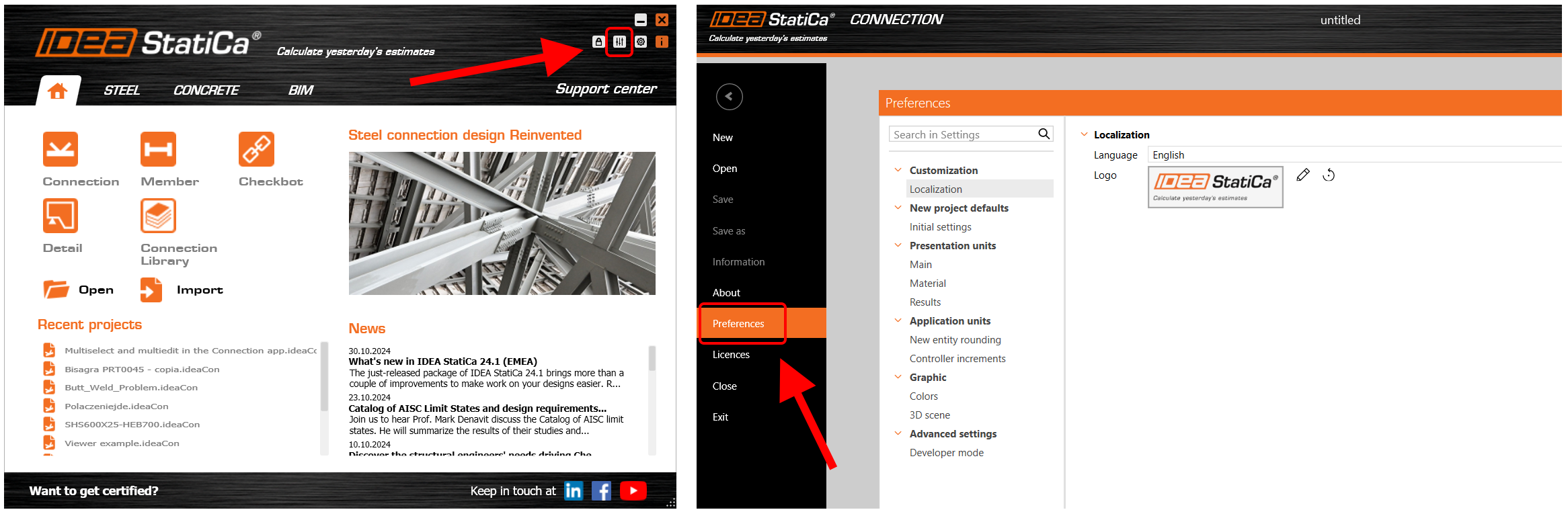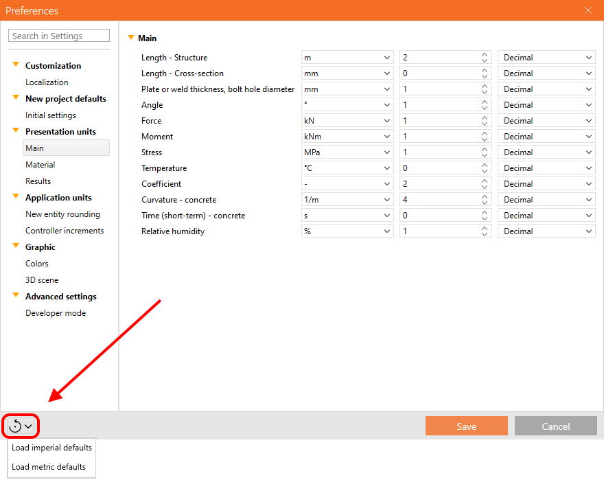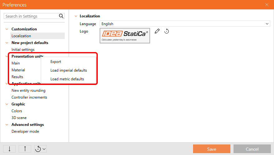 The Preferences dialogue can be accessed from the starting IDEA StatiCa app or in a backstage menu of each listed app. Once the changes in preferences are saved, they will be applied to all other apps.