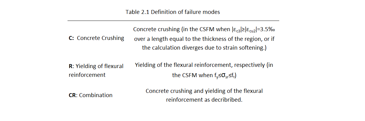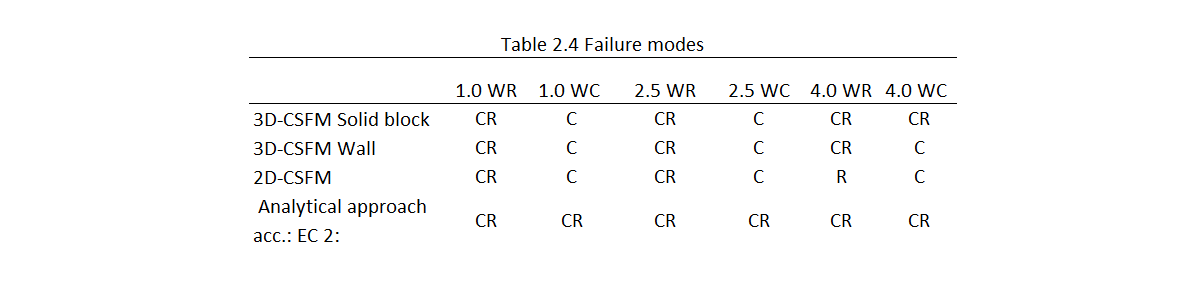 To evaluate the performance of the 3D-CSFM in comparison to the 2D-CSFM and established analytical methods, we classify observed failure modes into three categories: Concrete crushing (C) and yielding of flexural reinforcement (R), or a combination of these two (CR). This classification allows for a structured comparison of failure mechanisms as predicted by different modeling approaches. Table 2.1 defines mentioned failure types by specifying material limit values. The models were specifically designed with robust shear reinforcement to exclude failure due to shear and focus solely on simple bending behavior.