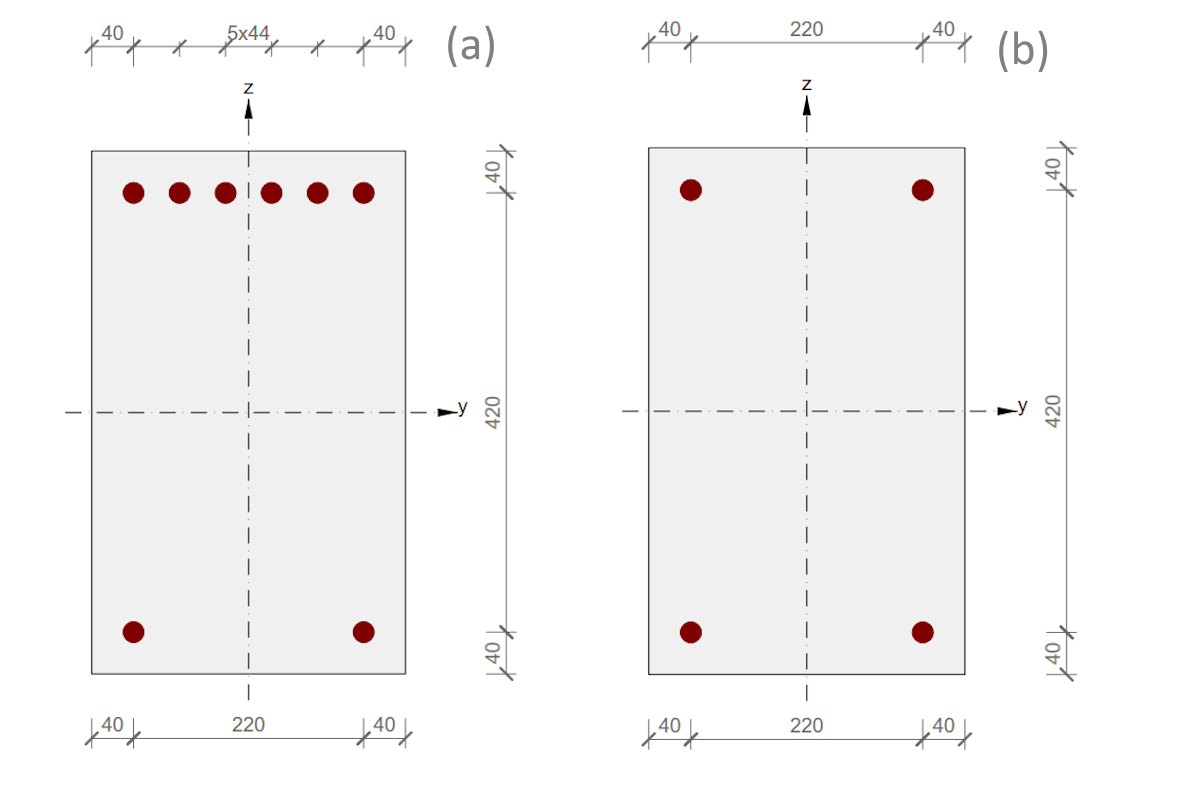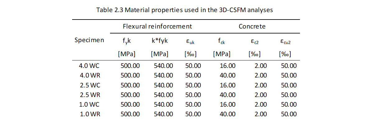 The material properties of concrete and flexural reinforcement used in the CSFM analysis are summarized in table 2.2. The yield stress (fyk) and the ultimate stress (k*fyk) of the reinforcement as well as the compressive strength (fck), plastic strain(ɛc2) and limit plastic strain (ɛcu2) of the concrete and were selected to clearly illustrate the behavior of the materials under stress.