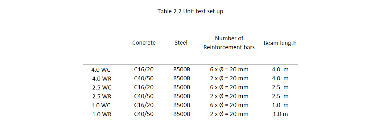 The WC are of a concrete grade C16/20 featuring six reinforcement bars, and WR setups using concrete grade C40/50 with two reinforcement bars. The lengths of the test examples varied, measuring 1.0m, 2.5m, and 4.0m.