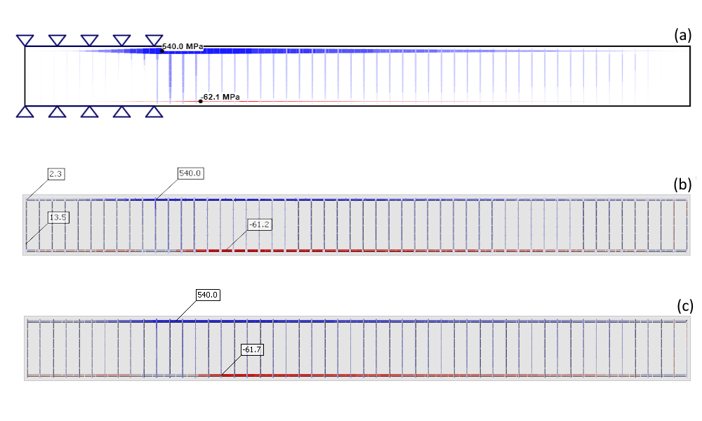 \[ \textsf{\textit{\footnotesize{Fig. 1.9\qquad Calculated value of reinforcement stress on WR 4.0 different model types: (a) 2D, (b) 3D - Solid Block, (c) 3D - Wall}}}\]