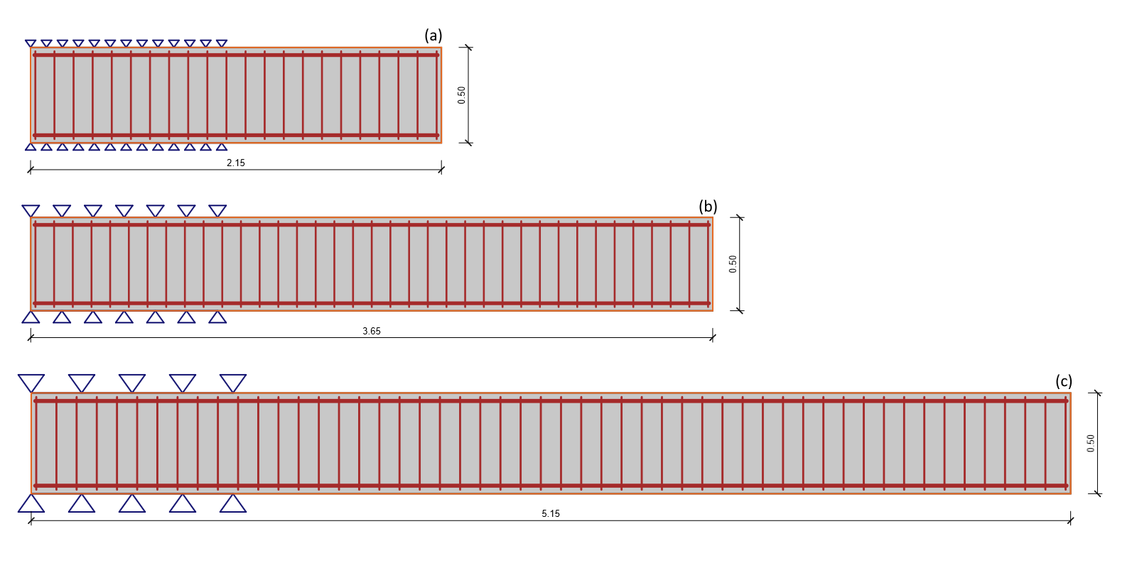 The flexural reinforcement in the models consisted of continuous reinforcing bars with a diameter of Ø = 20 mm. The WR (Weak Reinforcement) model utilized two reinforcement bars, while the WC (Weak Concrete) model included six. The shear reinforcement, made up of Ø = 10 mm stirrups spaced 100 mm apart, was deliberately designed to be robust, thereby precluding any shear failure mode. The shear reinforcement is consistent for all the models.