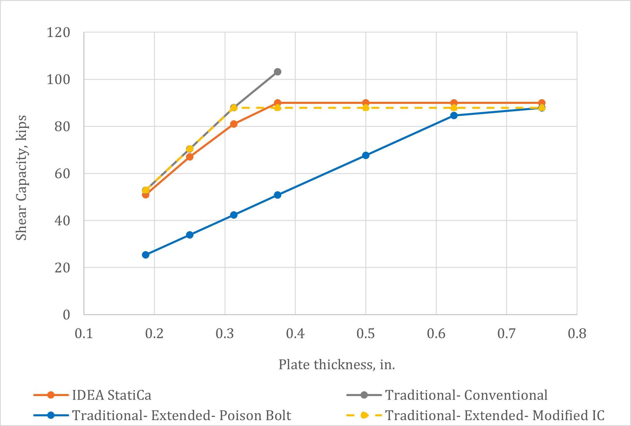 | Plate Thickness | IDEA StatiCa | Traditional Conventional | Traditional Extended (Poison Bolt) | Traditional Extended (Modified IC) |