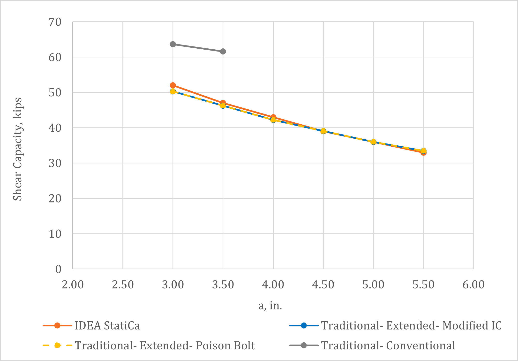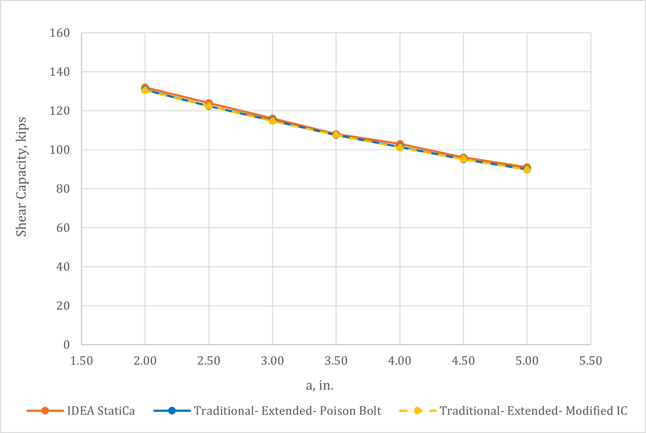 Variation of the shear capacity of the connections with the distance a is presented in Fig. 4. Bolt shear rupture was the controlling limit state for all values of a and all methods of calculation. The IDEA StatiCa results match well with the traditional calculations for the extended configuration. Where applicable, the traditional calculations for the conventional configuration give somewhat greater shear capacity. The reason for this is that a reduced eccentricity of a/2 is permitted to be assumed for conventional configurations per Table 10-9 of the AISC Manual (2017). The eccentricity of the bolt group is taken as a for the extended configuration calculations. The eccentricity of the bolt group is also equal to a for IDEA StatiCa because the point of zero moment was defined to be at the weld line. The poison bolt method and the modified IC method provide the same results indicating that tearout did not control for any bolt (i.e., the plate and beam web were sufficiently thick and the bolt spacing and edge distances were sufficiently large).