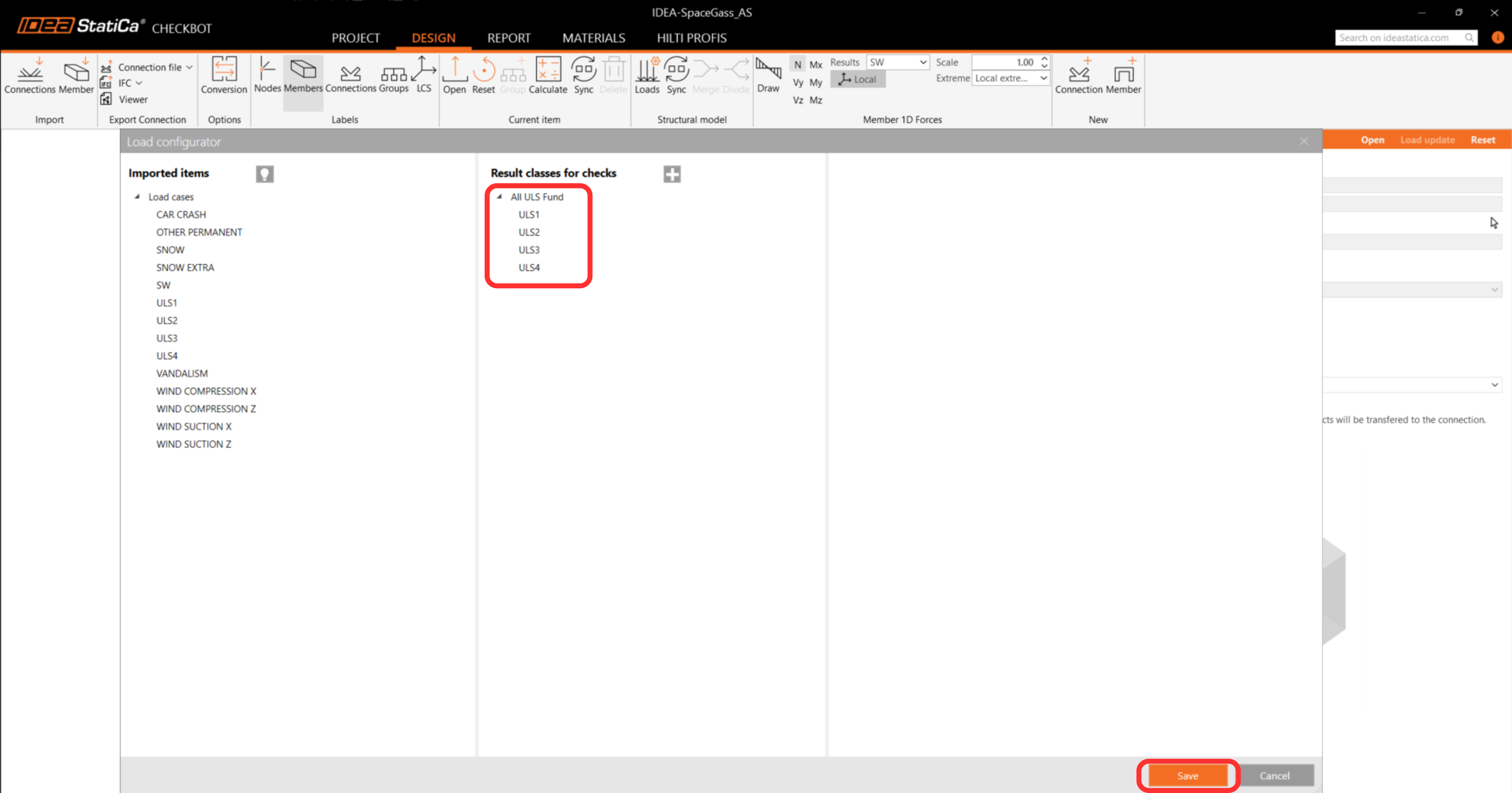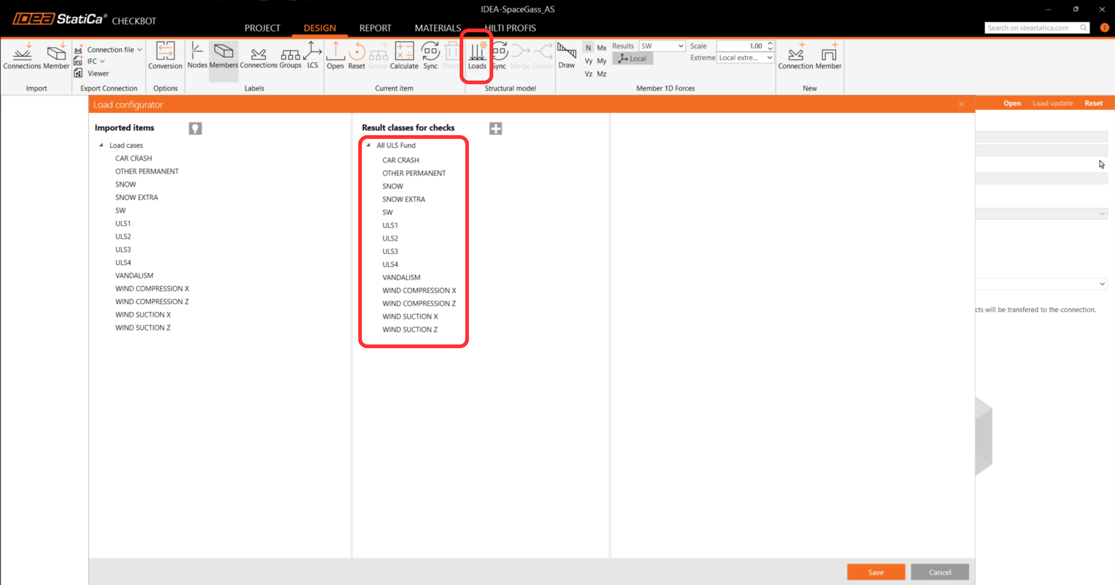 All the load cases and load combinations will be imported into Checkbot. Click Loads to view them. Result class "All ULS Fund" will be used for checking the connections, hence we need to remove load cases and only keep load combinations.