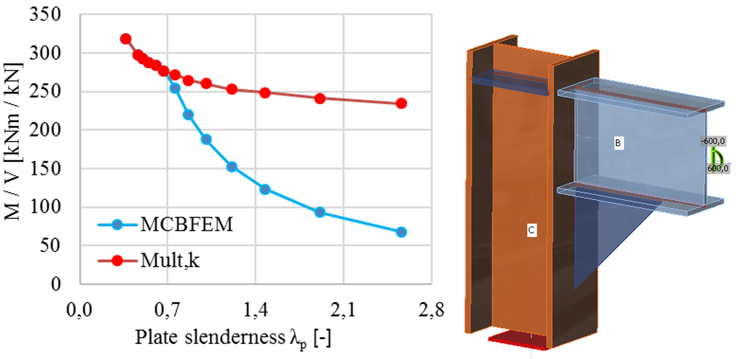 The influence of the plate slenderness on the plastic resistance, Mult,k, and buckling resistance, MCBFEM, is shown in the figure below. The diagram shows the results of a numerical study of a triangular stiffener in a portal frame joint.