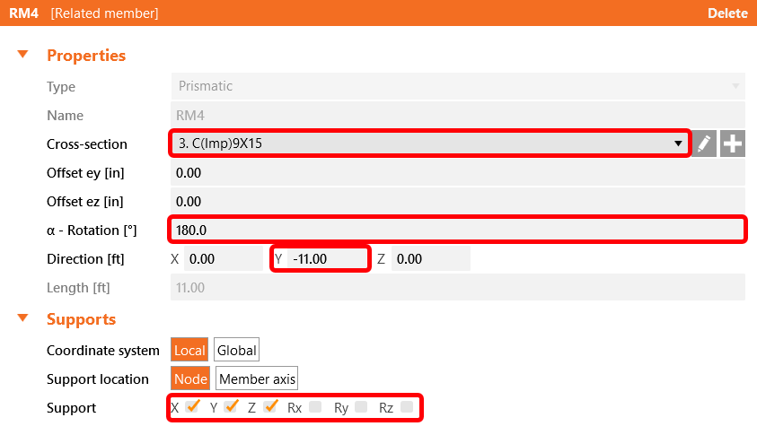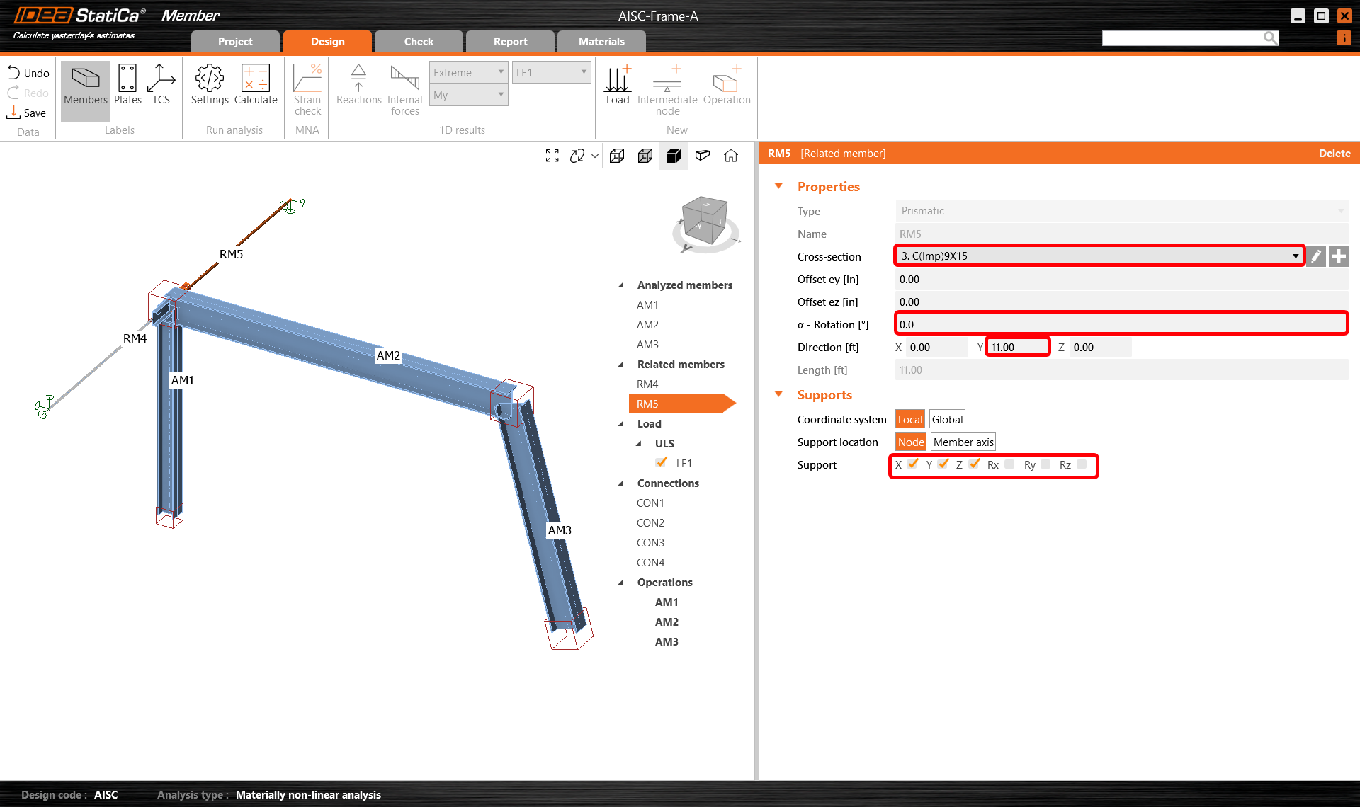Then select the related member RM4 either in the 3D scene or in the tree list and modify its properties as cross-section, length, orientation, and supports at the free ends.