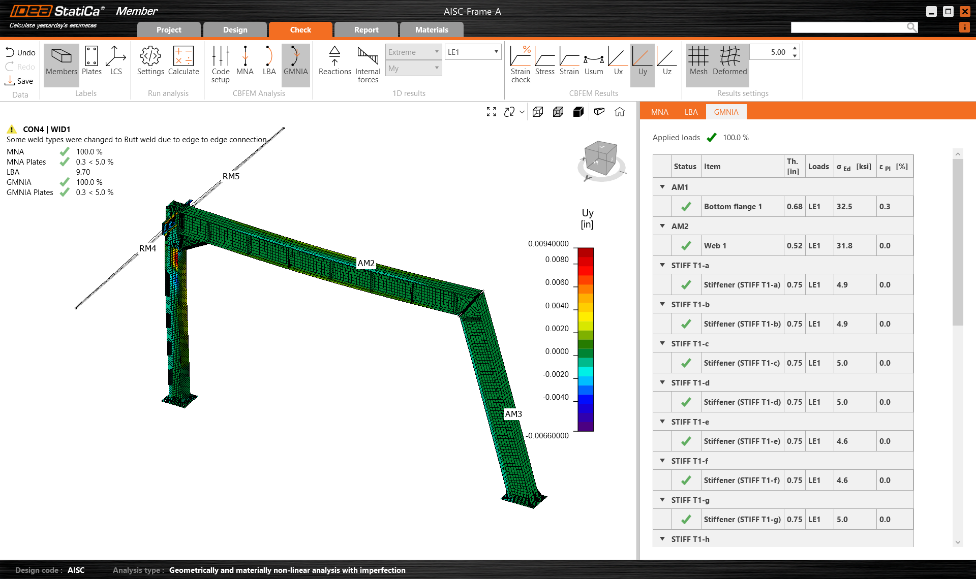 Now go back to tab Check and repeat the calculation in three steps - MNA, LBA, GMNIA. The designed frame passed the stability code-checks with applied initial imperfections, and you can browse the results such as strain distribution and internal forces diagram.