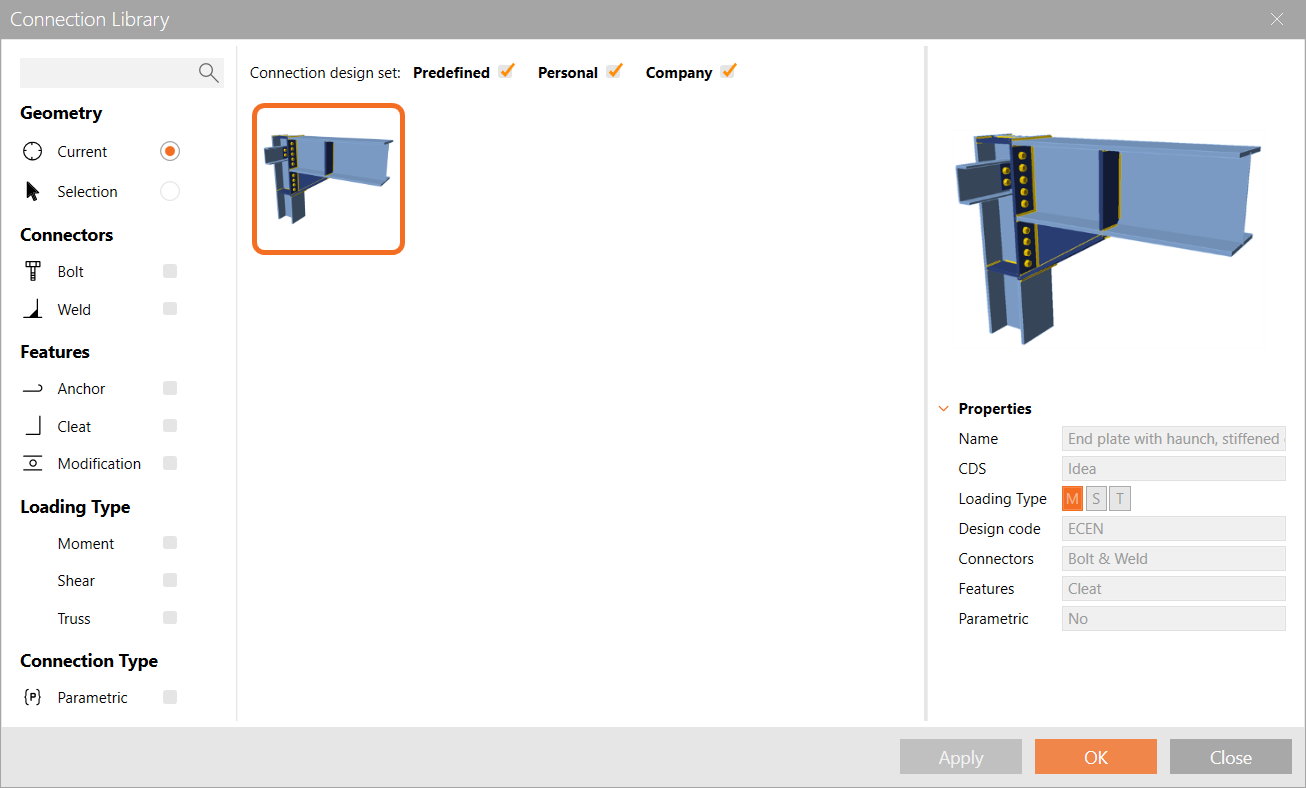 Start with joint CON1 at the left column base. IDEA StatiCa Connection application module opens, and you can design the joint by adding the manufacturing operations.