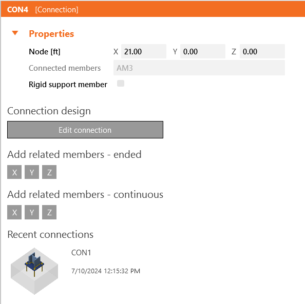 To add related members, which act as supports and load-transferring parts for the structural detail, click on the node cube in the 3D scene or select CON2 in the tree list. Here you can add either ended or continuous related members by clicking on the axis directions X, Y, Z according to the global coordinate system. Add 2 ended members in the Y direction.