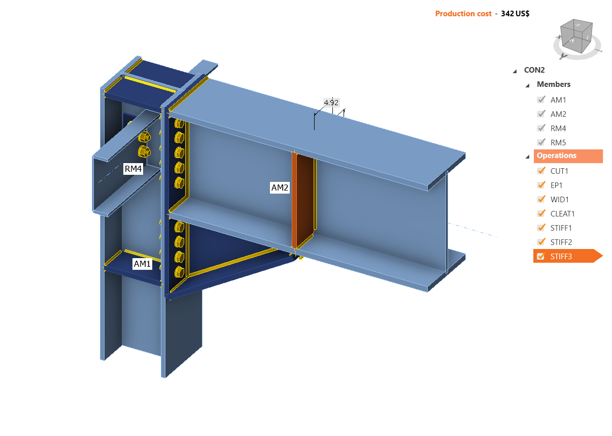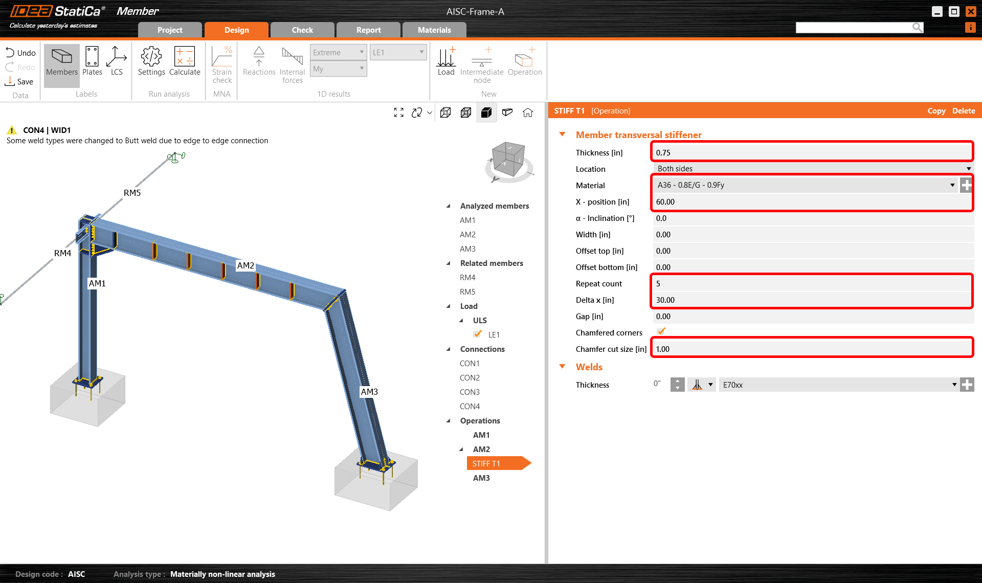Then modify the stiffener parameters and add one more transversal stiffener to the same beam AM2 and another one to the column AM3 and set them in the right position.